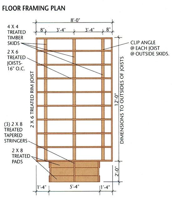 4. Set the floor frame on top of the skids and measure the diagonals to make sure it's square. Install metal clip angles at each joist along the two outer skids, using 1 1/2" joist hanger nails and 16d galv. common nails, and toenail each joist to the center skid with 16d galv. nails.