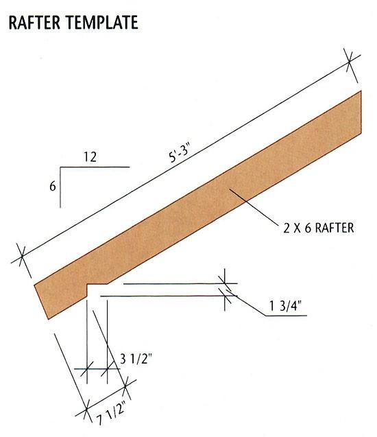 1. Cut two pattern rafters, following the RAFTER TEMPLATE. Test-fit the rafters using a 2 × 8 spacer block, then cut the remaining twelve common rafters. Cut eight rafters for the gable end overhangs these do not have bird's mouth cuts.