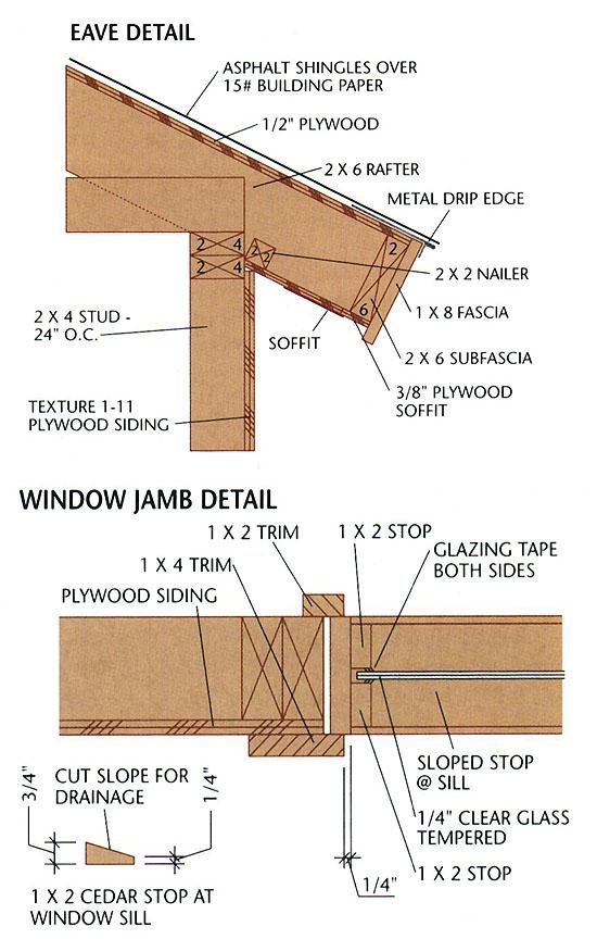 3. Cut the 1 × 2 stops. Bevel the outer sill stops as shown in the WINDOW JAMB DETAIL. Attach the inner stops with 6d galv. finish nails. Order the glass to fit.