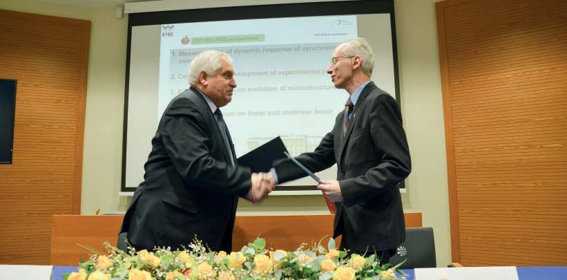 roczyste podpisanie umowy dotyczącej współpracy w ramach Narodowego Centrum Promieniowania Synchrotronowego SOLARIS pomiędzy Uniwersytetem Jagiellońskim a Politechniką Krakowską odbyło się 14 stycznia 2016 w sali konferencyjnej Centrum. Zgromadzonych gości, w tym liczną delegację z Politechniki Krakowskiej, powitał dyrektor SOLARIS prof. Marek Stankiewicz, który podkreślił, że krakowski synchrotron to pierwsze tego typu w Polsce i jedyne w Europie Środkowej najnowocześniejsze urządzenie badawcze, zapewniające wyjątkowe zaplecze do badań interdyscyplinarnych integrujących wiele środowisk naukowych. Podkreślając znaczenie podpisywanej umowy, prorektor UJ prof. Stanisław Kistryn poinformował, że nawiązywana współpraca ułatwi wymianę myśli i doświadczeń między naukowcami pracującymi na obu uczelniach. – Jestem przekonany, że obie strony na tym skorzystają. Politechnika dysponuje szeroką wiedzą na temat monitorowania działalności tego typu infrastruktury, szczególnie pod względem mechanicznym – mówił prof. Stanisław Kistryn. Rektor Politechniki Krakowskiej