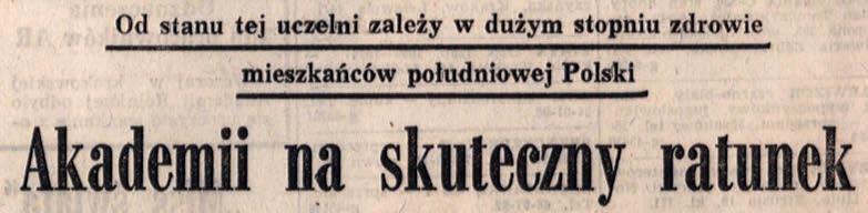 Akademii. Potrzebne wsparcie resortu i makroregionu, w „Dzienniku Polskim”, podkreślał rangę uczelni kształcącej kadry medyczne dla całego makroregionu południowowschodniego, zaznaczając, że budowa nowego szpitala klinicznego w Prokocimiu odwleka się w czasie. Z kolei „Gazeta Krakowska”, w tekście Akademii na skuteczny ratunek z podtytułem Od stanu tej uczelni zależy w dużym stopniu zdrowie mieszkańców południowej Polski, napisała: Tymczasem warunki Akademii są opłakane. Jej obiekty są porozrzucane w 15 punktach miasta, niektóre budynki mają wartość historyczną i wręcz nie nadają się do dalszej eksploatacji. Niemal równoczesne pojawienie się trzech artykułów na ten sam temat było efektem spotkania władz miasta i województwa z władzami Uczelni. Na spotkaniu tym omawiano opracowany we wrześniu 1987 roku dokument Program poprawy krytycznego stanu bazy materialnej Akademii Medycznej im. M. Kopernika w Krakowie, zaczynający się od stwierdzenia: Ponad 30 lat temu istniejąca baza lokalowa Akademii Medycznej została uznana za nieprzydatną do pełnienia podstawowych funkcji Uczelni, a ograniczone możliwości i niecelowość ekonomiczna jej modernizacji na drodze remontów kapitalnych została wzięta za podstawę decyzji Władz Państwowych o budowie Nowego Zespołu w Prokocimiu, podjętej w roku 1959. Z raportu dowiadujemy się również, że na podstawie przeprowadzonej – na polecenie ministra zdrowia i opieki społecznej w 1969 roku – oceny stanu obiektów ówczesnego Państwowego Szpitala Kli-