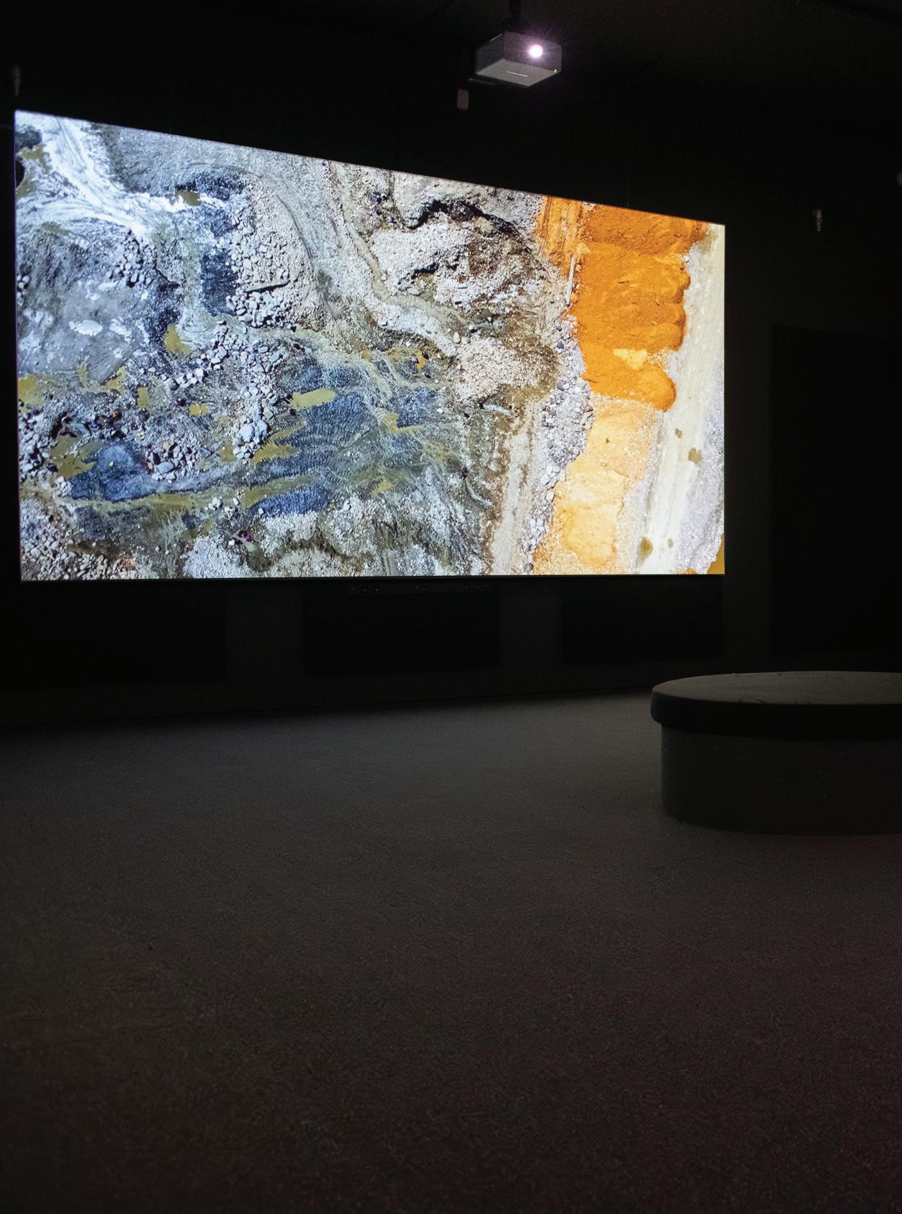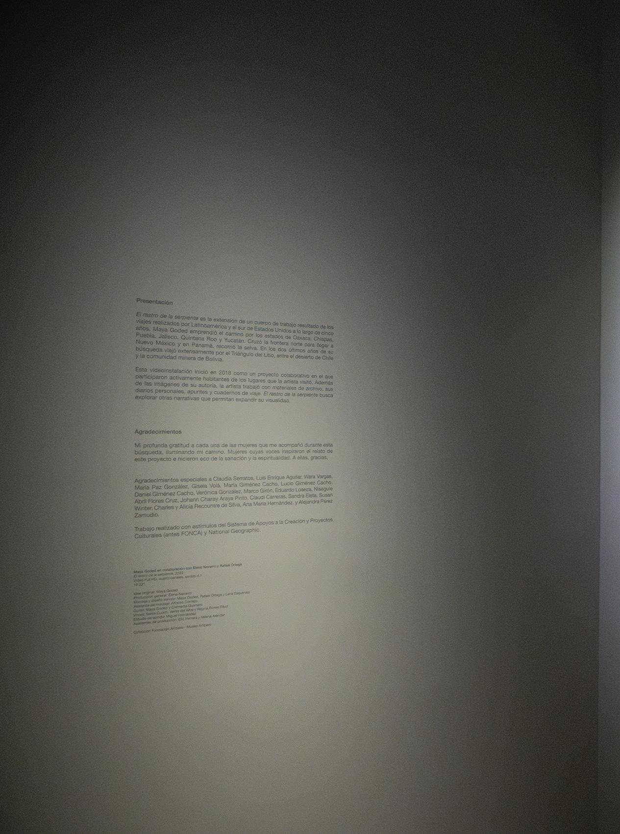 Esta videoinstalación inició en 2018 como un proyecto colaborativo en el que participaron activamente habitantes de los lugares que la artista visitó. Además de las imágenes de su autoría, la artista trabajó con materiales de archivo, sus diarios personales, apuntes y cuadernos de viaje. El rastro de la serpiente busca explorar otras narrativas que permitan expandir su visualidad.