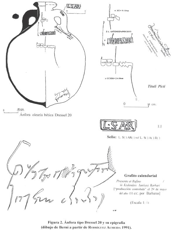 ram pela parte oriental e até chegaram à Índia!” Acontece, porém, que, no Monte Testaccio –formado pelos ‘montes’ de ânforas que, chegando ao Tibre, depois de despejadas, eram atiradas para ali, como lixo –, essas ânforas não ostentam apenas a marca do fabricante, muitas delas apresentam também o que poderíamos chamar de “etiquetas”, palavras pintadas no bojo (tituli picti), que fornecem elementos preciosos de informação acerca “da tara da ânfora; o seu conteúdo líquido; o nome da pessoa ou pessoas que intervieram na sua comercialização; e um controlo aduaneiro-fiscal em que se faz constar o local donde se expediu a ânfora, se certifica o volume contido, se indicam os personagens intervenientes nesse controlo e a datação consular” (p. 15). Um mundo de informações fornecido por estes documentos: “dados seriados e datados com precisão, o que é extremamente raro”. Mostra a Fig. 2, que, com a devida vénia, se reproduz da pág. 17, esse enorme acervo documental proporcionado.