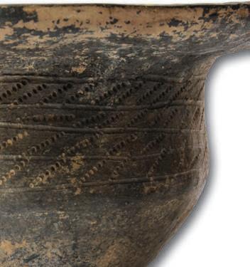 Composição de vasos cerâmicos da Idade do Bronze que se inserem numa tipologia muito particular, caracterizada pelo largo bordo horizontal. A peça da foto está exposta no Núcleo Museológico de Arqueologia