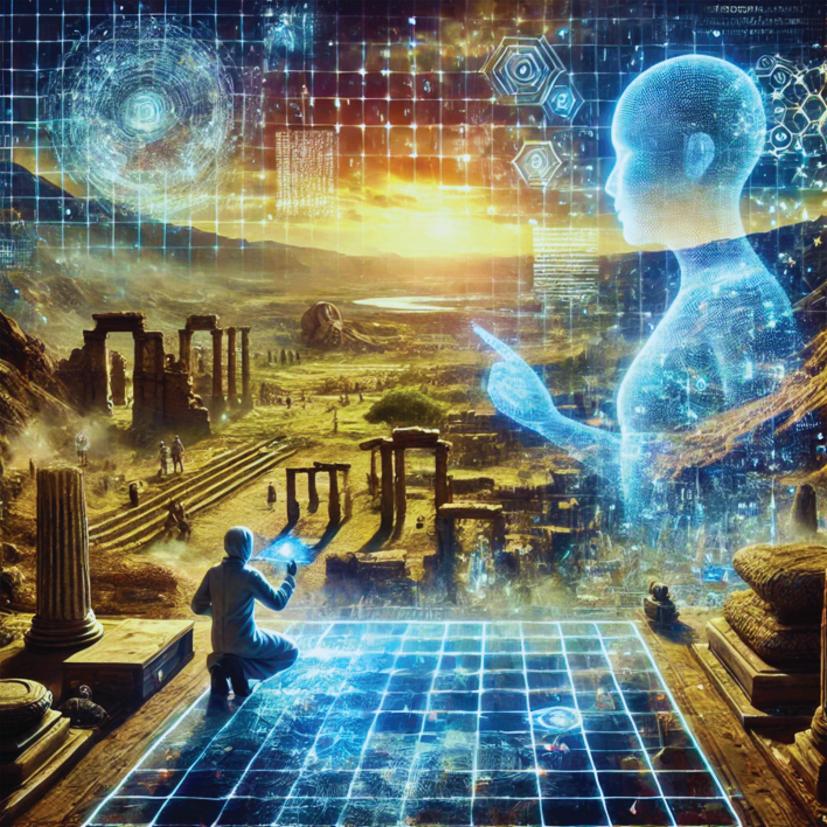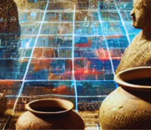 Composição sobre ilustração gerada por Inteligência Artificial a partir de uma instrução inicial, num “delírio” que exemplifica as novas abordagens interpretativas ao alcance desta ferramenta tecnológica, mas também a tensão entre a especulação criativa e o rigor por que se devem pautar as Ciências Sociais e Humanas, nomeadamente a Arqueologia.