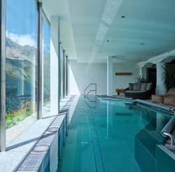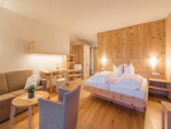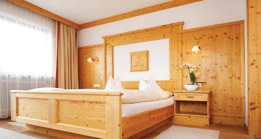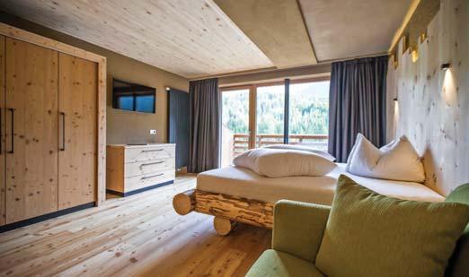 Zimmer und Suiten aus handgearbeitetem Natur-Zirbenholz, Restaurant mit Terrasse und Bar, Außen-Schwimmbad, Whirlpool, Wellnessbereich, Fitnessraum, kostenloses WLan