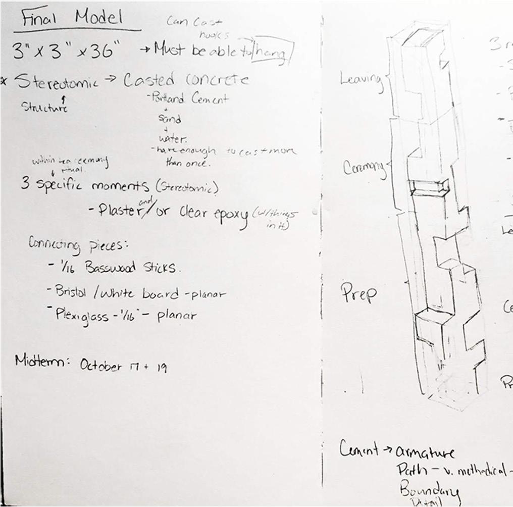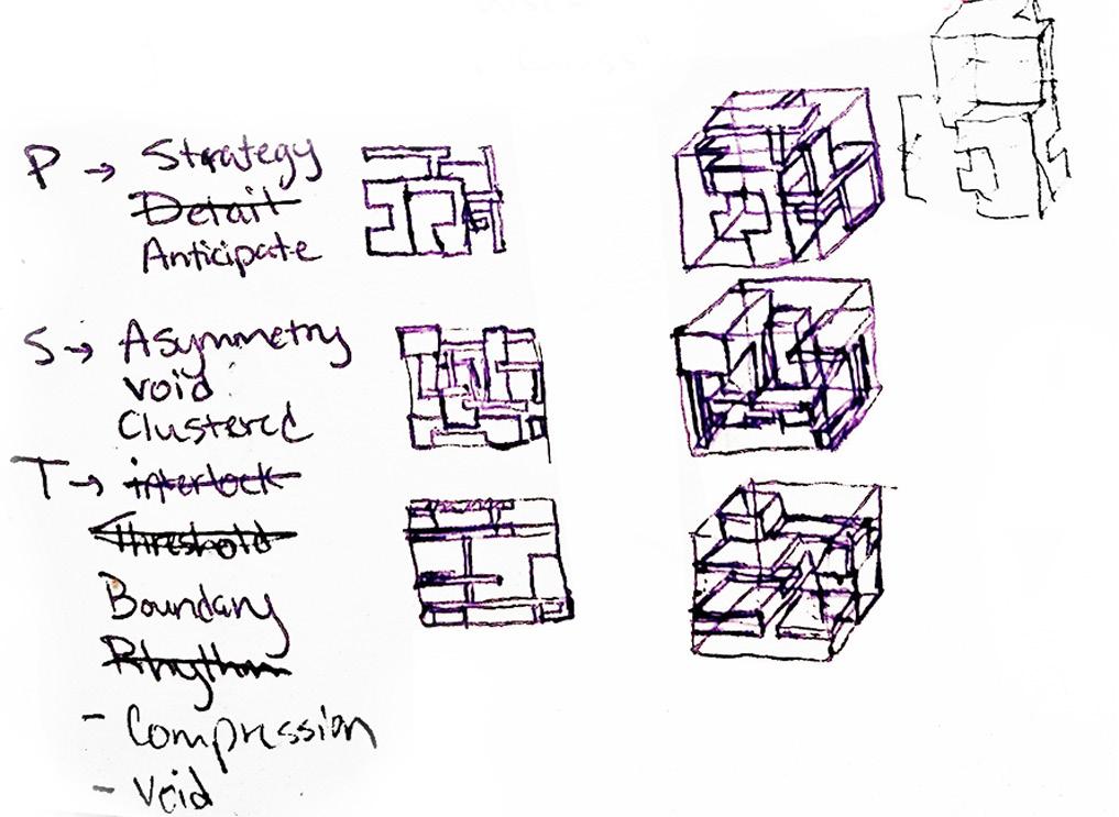 utilizing spatial terms. Per the snippet from my sketchbook, I began with determining three themes from which I extrapolated primary, secondary, and tertiary thematic spatial terms