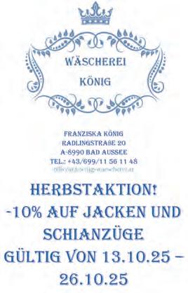 Auch die einstige „Prachtstraße“ der Ausseer, die Ischler Straße, hat in den letzten Jahren ordentlich Patina angesetzt – vor allem, wenn man nun schon seit längerem von der Marktleite kommend links und rechts der Straße von leerstehenden und nicht gerade einladenden Gebäuden begrüßt wird. Und auch die Standln beim Wochenmarkt werden – bei einem direkten Vergleich von Fotos der letzten zwei Jahrzehnte – immer weniger. Das gibt keine gute Visitenkarte ab und zeigt auf, dass Aussee offensichtlich am „absterbenden Ast“ ist. Junge, frische Ideen sind gefragt Aber es gibt auch Lichtblicke, indem viele junge Generationen in und um Aussee die Betriebe ihrer Eltern übernehmen oder schon übernommen haben. Von Osten kommend zum Beispiel beim Autohaus Schiffner, bei Möbel Peer, bei Rastl – Tracht am Meranplatz, bei der Schneiderei Greul, bei Spatt/Wach – Salon Aussee, im „Weißen Rössl“, bei „Ausseer G’wand“ Veigl gleich alle beide, bei der Goldschmiede Steiner ebenfalls zwei, bei Handdrucke Sepp und Peter Wach, im Kaufhaus Winkler, bei der Bäckerei Schlögel, beim Fachgeschäft Hollwöger wie auch beim Uhren- und Schmuckfachgeschäft Pleiner die junge Generation am Werk ist. Zwar nicht familiär als Nachfolger, aber als junge Unternehmer seien auch noch die neuen Gastgeber beim Café Strennberger genannt.