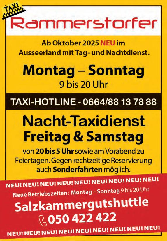 Aufgrund eines Ziffernsturzes von Seiten des Anbieters wurde in der letzten Ausgabe eine falsche Telefonnummer für das Taxiservice der Firma Rammerstorfer veröffentlicht. Die richtige Nummer lautet 0664 - 88 13 78 88. Der Betreiber, Werner Rammerstorfer, bittet, diesen Fehler zu entschuldigen.