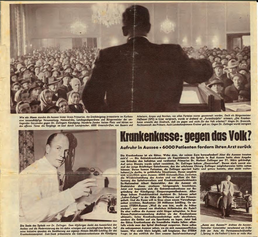 Krankenhauses nicht wünscht, da jeder Patient Kosten verursacht. Auch der oft argumentierte „Ärztemangel“ kann so groß nicht sein, wenn man verdiente Mediziner vorzeitig mit „goldenem Handschlag“ von ihrem Arbeitsplatz wegkomplimentiert. Man fragt sich auch, warum in den Häusern in Leoben und Bruck an der Mur in den letzten Jahren Chirurgen, Unfallchirurgen und Anästhesisten gekündigt haben. Was man der Bevölkerung erneut ins Gedächtnis rufen sollte, ist – auch angesichts der eingangs erwähnten Begebenheiten in den 1950er Jahren –dass man es als demokratisches Grundrecht ansehen muss, wie mit den aktuell über 30-prozentigen Steuermehreinnahmen gearbeitet wird. So viel Geld wie jetzt wurde vom Staat noch nie eingenommen. Nur der Souverän, das Volk, kann mit Druck darauf bestehen, was eigentlich selbstverständlich sein müsste: eine ordentliche Gesundheitsversorgung in erreichbarer Nähe zu sichern. Faksimile aus dem „Stern“, als im Winter 1954 über 6.000 Einwohner des Ausseerlandes auf die Barrikaden stiegen, um sich eine ordentliche Gesundheitsversorgung zu erkämpfen. Der Kampf um dieses Recht zieht sich wie ein roter Faden durch die Geschichte.