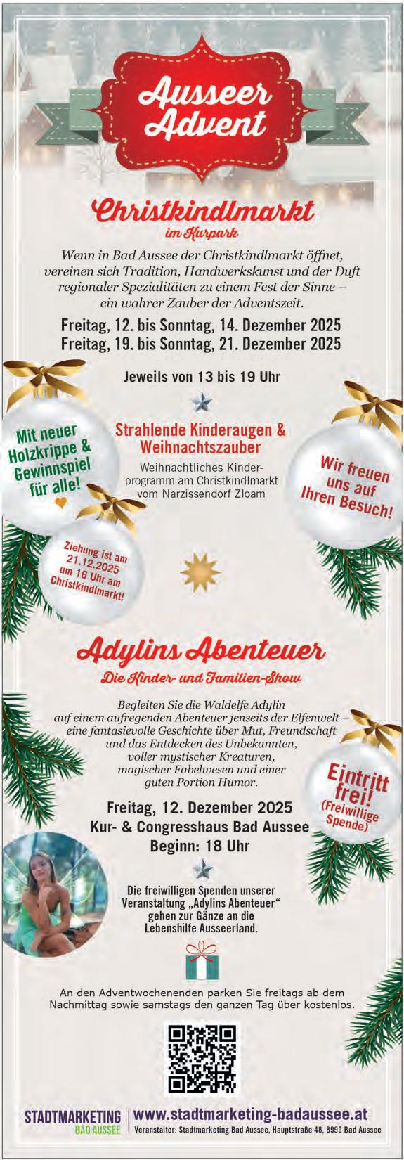 die Ischlerstraße in Bad Aussee zur weihnachtlichen Fußgängerzone mit Live-Musik, Punsch, Glühwein, kulinarischen Köstlichkeiten und vielem mehr. Ebenso wird die Vereinsbar für Partystimmung vom Feinsten sorgen. Kommt vorbei und genießt dieses vorweihnachtliche Fest.
