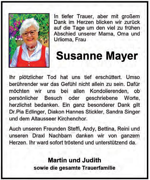 werden. An dieser Stelle sei nochmals auf den Infoabend „Der Loser. Ein- und Ausblicke“ am Donnerstag, 11. Dezember, um 19 Uhr im Veranstaltungssaal Altaussee hingewiesen, zu dem die Bevölkerung herzlich eingeladen ist. Ein Abend voller Information, Inspiration und Zuversicht über und für den Loser.