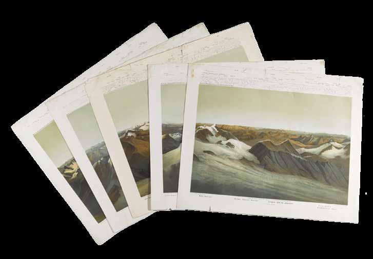 Mehr als 300 Panoramen verkaufte der Alpenverein „beispiellos billig“ um 10 Gulden, danach waren sie im Kunsthandel um 15 Gulden erhältlich. Dennoch sind heute nur sechs vollständige Serien nachweisbar. Eine davon konnten wir nun erwerben. Die Abbildung zeigt zuoberst Blatt IV mit dem Oberen Pasterzenboden im Vordergrund und dem Fuscherkarkopf mit der Gamsgrube im Zentrum.