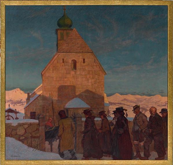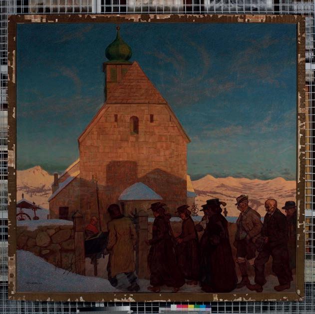 Der letzte Gang“ (1912) gehört zu den reifsten und eindrucksvollsten Gemälden des Wiener Bergsteigermalers Otto Barth (1876–1916). Das Bild erzählt von Gemeinschaft, Abschied und Zusammenhalt im Gebirge: Eine Gruppe von Menschen begleitet eines ihrer Mitglieder auf seinem letzten Weg und erweist ihm in stillem Gedenken die letzte Ehre. Die harmonischen malerischen Kontraste zwischen der in leuchtendes Abendrot getauchten Kirche und dem bleichen Weiß der Schneelandschaft unter dem satt mattblau gefärbten Himmel des späten Nachmittags spiegeln sich in den Gesichtern der Trauernden wider. Unsere letzte Ehre gilt dem großzügigen Spender dieses außergewöhnlichen Gemäldes, Dr. Alfred Lechner aus Wien. Sein Herzenswunsch bei der Übergabe war