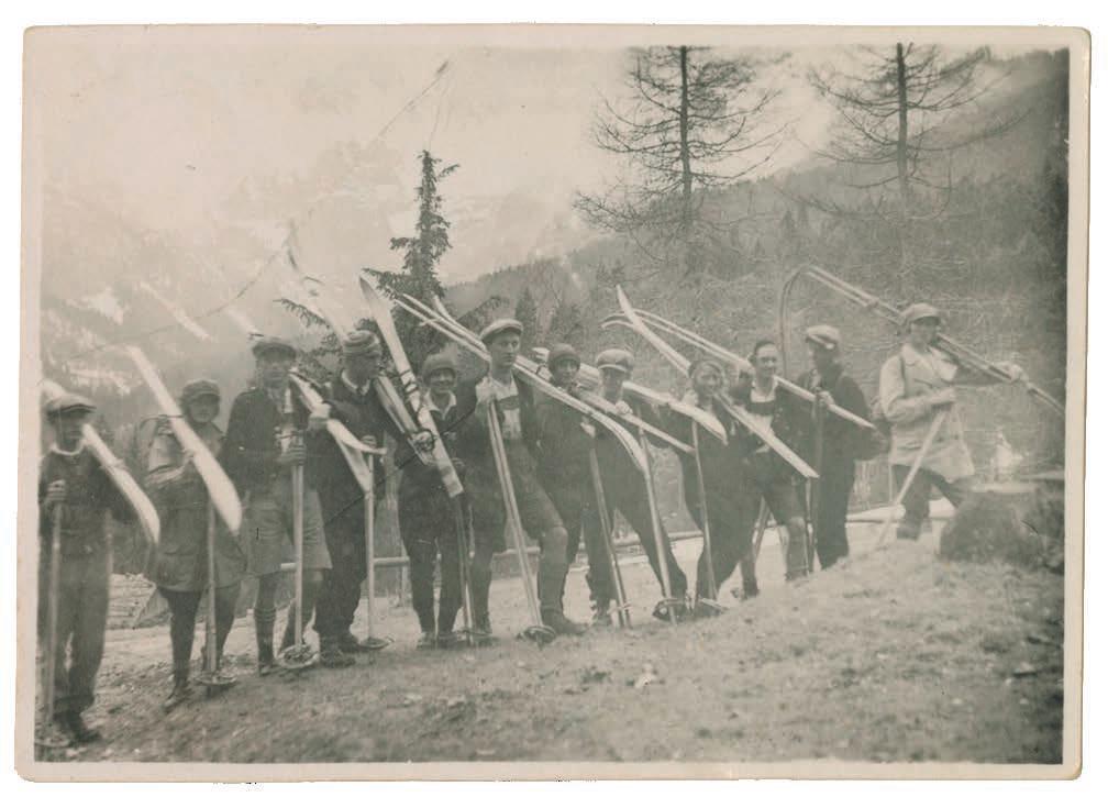 Bevor wir der Frage des fehlenden Schnees nachgehen, werfen wir zunächst einen Blick auf die Ausrüstung der Skifahrer. Die Skier, die die jungen Alpinistinnen und Alpinisten auf ihren Schultern tragen, haben mit heutigen Skiern fast nur den Namen gemeinsam. Welch ein Unterschied! Die Sportgeräte im Bild sind lange, an der Spitze aufgebogene Holzbretter, ohne den heute üblichen Kunststoffbelag und noch ohne Metallkanten.