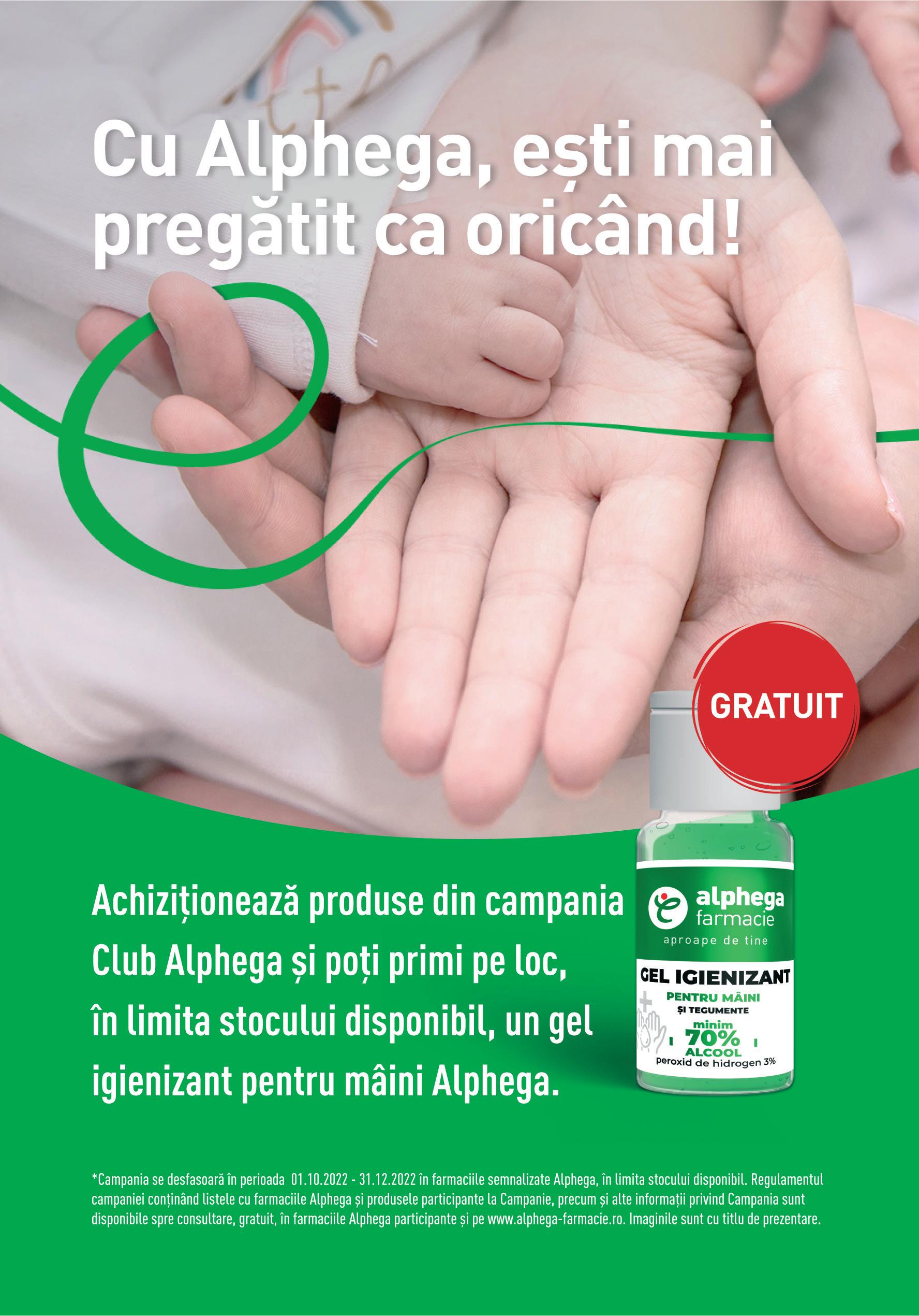 online, la cererea tuturor clienților interesați. Ofertele din acest catalog nu se cumulează cu alte oferte Alphega aflate în desfășurare. Unele oferte se pot prelungi la inițiativa exclusivă a Alliance Healthcare România S.R.L.. Informațiile despre produse și ofertele aferente sunt prezentate sub rezerva erorilor de tipar. Pentru o informare completă despre proprietățile și/sau caracteristicile produselor din catalog recomandăm consultarea informațiilor de pe etichetă, ambalaj și/sau prospect. Imaginile sunt cu titlu de prezentare, iar fotografiile produselor nu creează obligații contractuale.
