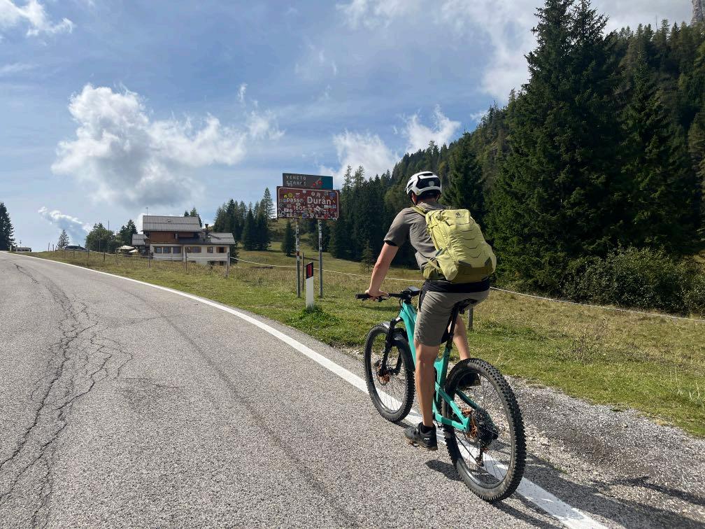 1000 Höhenmeter auf 10 Kilometer bis zur Mittagspause. Zunächst auf einem kleinen Asphaltsträßchen die ersten Höhenmeter ansteigend, später dann ein schöner Waldweg. In nur wenigen Abschnitten steil. Die folgende Asphaltstraße ist schmal und steil. Gut 300 Höhenmeter bis zur Cappuccino Pause. Danach weitere 250 sehr steile Höhenmeter. Italienische Betonplatten wenn es besonders steil wird. Nach der Mittagspause nochmals 250 Höhenmeter im Trail bergauf. Diese sind gut zu fahren, die Höhe muss man jedoch einkalkulieren. Trails auf knapp 2300 Metern Höhe. Die Abfahrt von der Forcella beginnt spektakulär. Ein schmaler Weg führt uns durch Wiesen- und Felsenlandschaften. Gut 150 Tiefenmeter sind hier sehr technisch. Weiter bergab über Wurzeltrails bis nach Pescul. Oberhalb von Alleghe zunächst steil auf Schotter hinunter. Die Alleghe Trails liegen nachmittags im Schatten, sind teilweise steinig und führen teilweise durch die Vorgärten der Anwohner. Aus diesem Grund fahren wir auch mal Schritttempo.