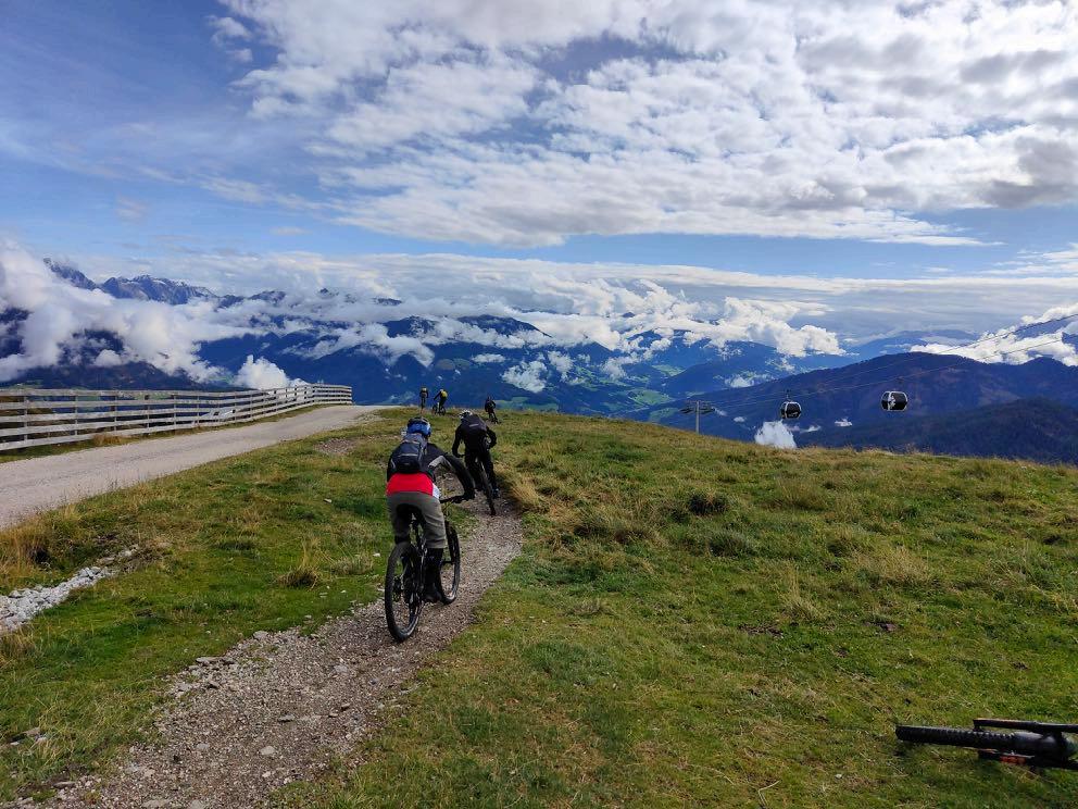 Stubaital, in die Zillertaler Alpen, dem Alpenhauptkamm, das Ahrntal, zum Kronplatz, in die Fanesgruppe bis hin zur Marmolata und Großglockner. Das Lüsner Almen Hochplateau wird von uns komplett ausgefahren. Am Astjoch angekommen freuen wir uns auf eine Stärkung. Die Mittagspause genießen wir auch heute wieder in der Höhe. Der Großteil der Höhenmeter liegt glücklicherweise auch bereits hinter uns. Über 2000 Höhenmeter geht es heute bergab. Gut gestärkt starten wir in den Downhill. Dieser führt weitesgehend durch den Ehrenburger Wald. Wir sind nun im Pustertal angekommen und kurbeln die letzten Höhenmeter auf ruhigen Wegen Richtung Hotel in Stefansdorf.