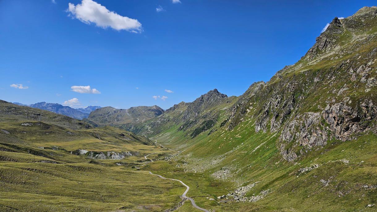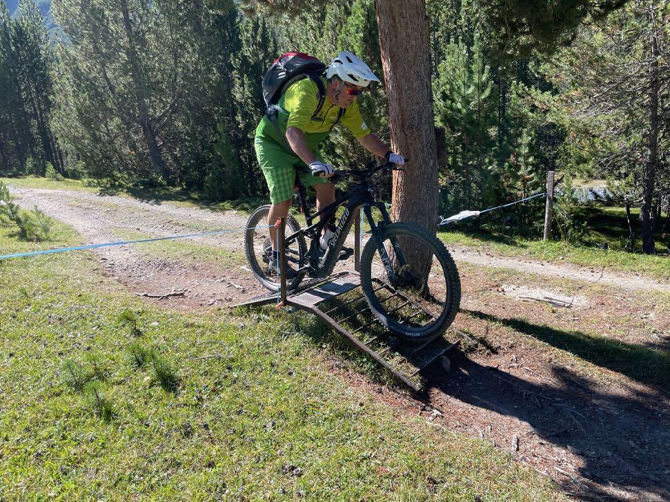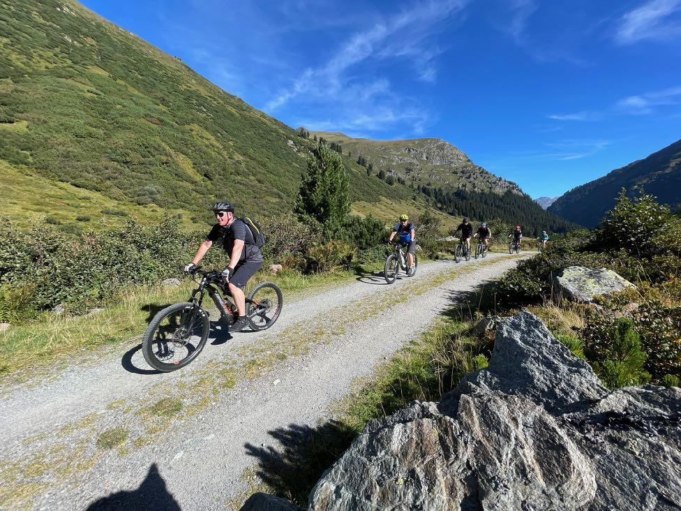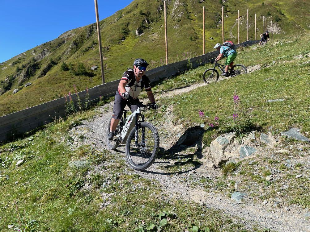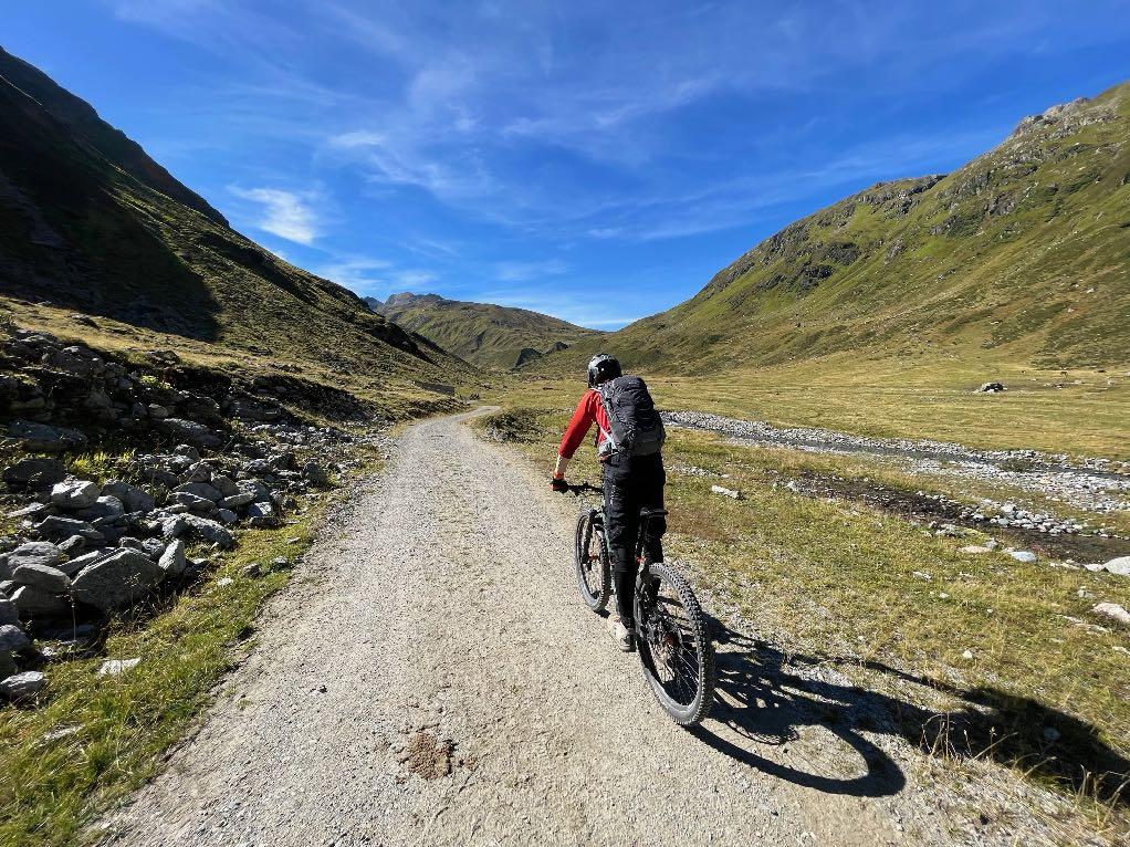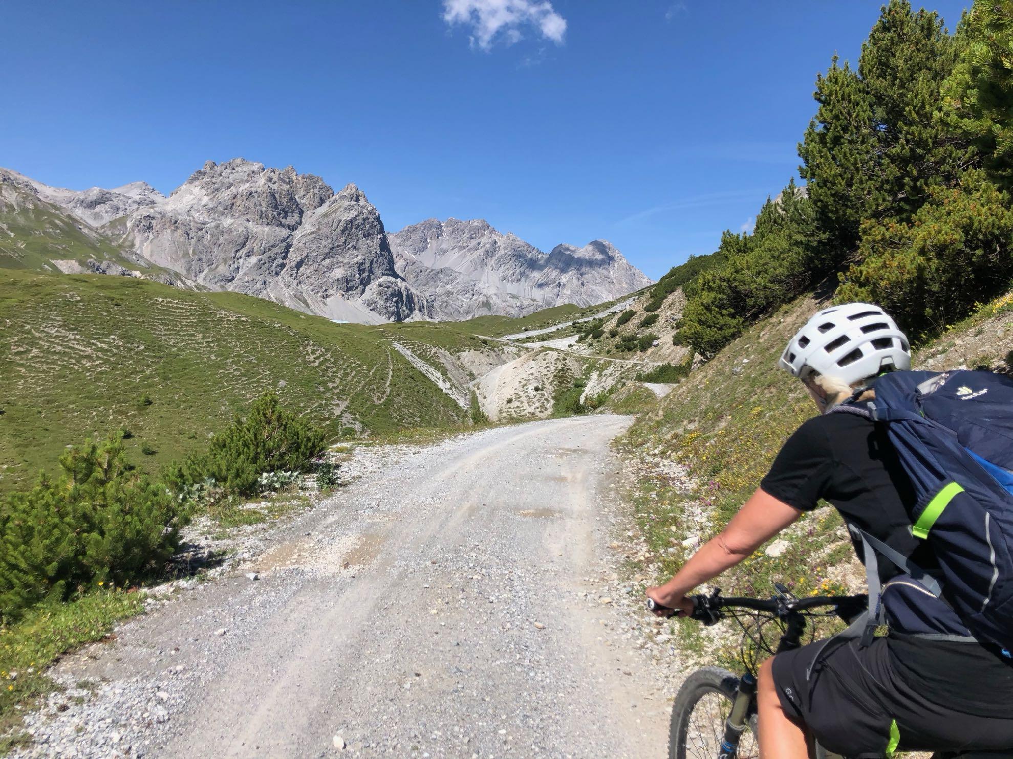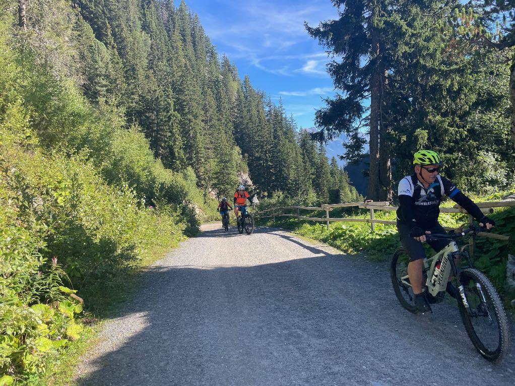 So könnte jeder Morgen beginnen. Ein herrlicher Schotterweg mit moderater Steigung führt uns zunächst ins Verwalltal hinein. Doch der Genuss hat eine Dreiviertel Stunde vor der Mittagspause ein jähes Ende. Gut 20 Minuten schieben stehen an. Eine steile, teils stufige Zwischenpassage muss von allen bewältigt werden. Am Hochplateau entschädigt uns jedoch gleich ein netter Singletrail mit schönstem Panorama. Nach der Mittagspause geht es zunächst auf breiten Schottenwegen teils steil bergab. Der Höhentrail zum Zeinissee ist gut fahrbar und erst zum Schluss sehr steil. Die letzten Kilometer nach Ischgl sind Genuß pur. Wir rollen teils auf Asphalt, teils auf herrlich weichen Waldwegen von oben direkt ins Hotel. Insgesamt ein perfekter Mountainbiketag mit allem, was sich Biker wünschen.