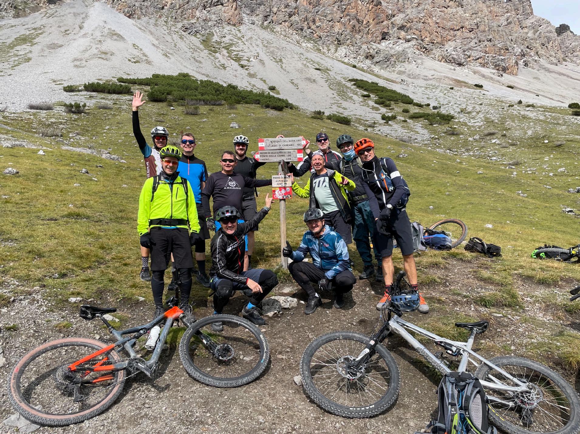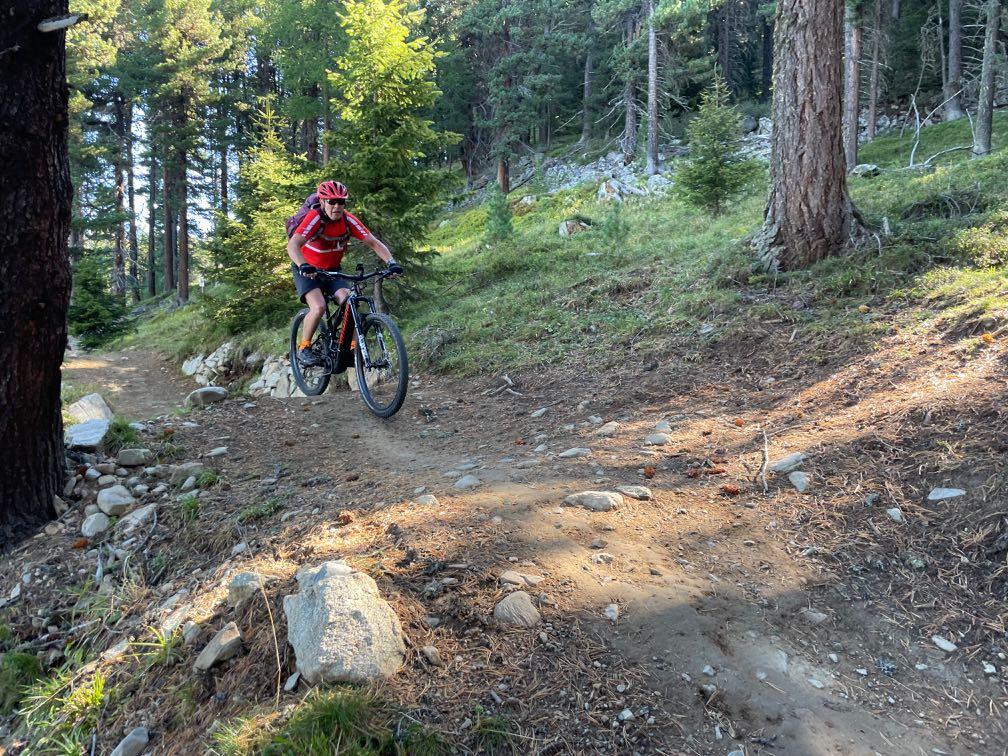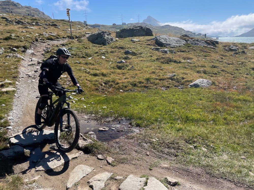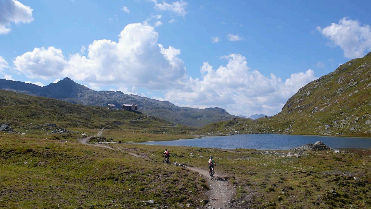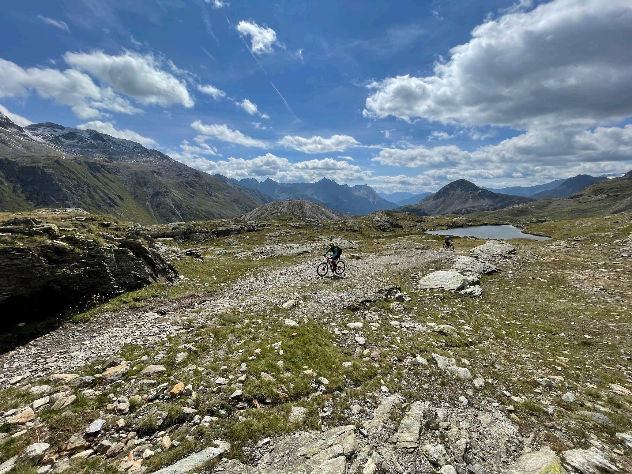 1000 Höhenmeter auf 55 Kilometer können ganz schön anstrengend sein. Dieses Resümee werden viele heute am Ende des Tages ziehen. Dabei erwarten uns den ganzen Tag nur beste Mountainbike-Wege auf unterschiedlichstem Untergrund. Zunächst geht es locker auf einem Asphaltradweg bergauf bis zum Einstieg der Schotterstrecke hoch zur Forcola di Livigno. Die letzten Spitzkehren auf einem schmalen Pfad sind nur erste Herausforderung für unsere Kletterer in der Gruppe. Wir genießen Cappuccino auf über 2300 Metern. Weiter geht es über einen Trail zum Bernina Pass. Von hier oben beginnt eine Traumabfahrt auf einem Naturtrail. Legendär ist auch der Trail weiter bis nach St. Moritz hinab. Wir rollen auf Schotter, Waldwegen und teils wurzeligen Singletracks. Auch die letzten Meter entlang der beiden Seen sind herrlichste Mountainbike-Wege. Ein rundum schöner Tag im hochalpinen Gelände.