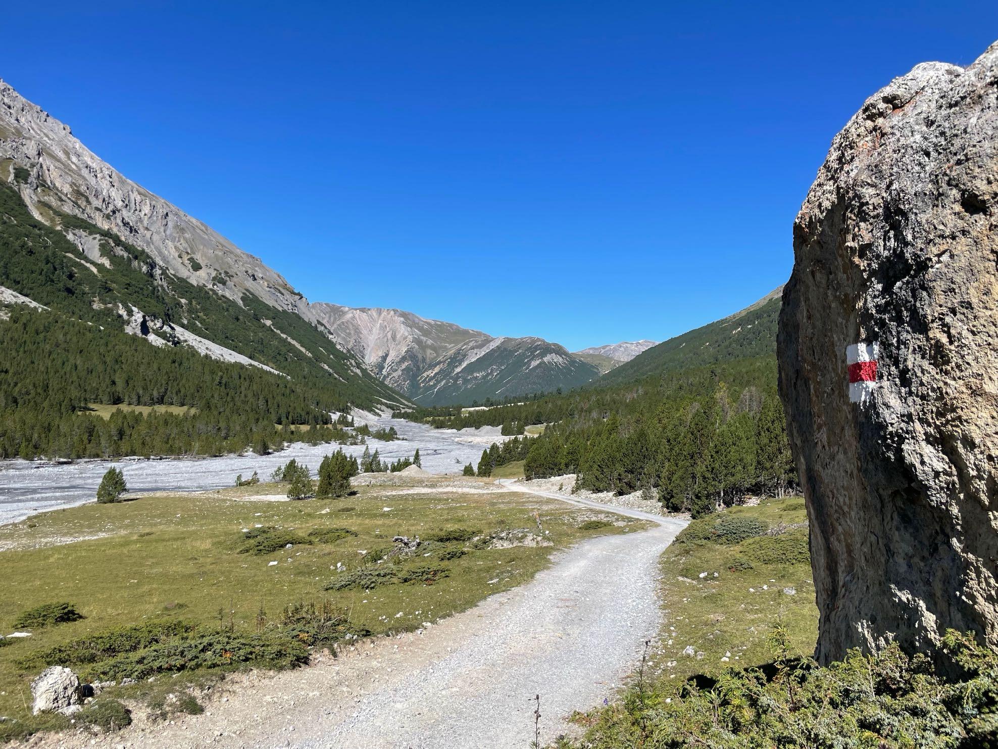Heute spielt das Mountainbike alle seine Trümpfe aus. Für Wanderer zu abgelegen, präsentiert das über 2000 Meter hoch gelegeneVal Mora eine einzigartige Kulisse und Vegetation. Den Anblick müssen wir uns jedoch verdienen. Wir starten früh, um Zeit für all die herrlichen Eindrücke zu haben. Schnell bleibt das Münstertal tief unter uns. Der Talkessel hoch zum Dös Radond erinnert an die einsame Bergwelt Kanadas. Mächtige Wasserfälle stürzen neben uns herab, kahle Felsklötze rücken immer näher. Dazwischen sprudelt munter ein kristallklarer Bergbach ins Tal hinab. Wir können uns an der Fototapete kaum satt sehen. Am 2200 Meter hoch gelegenen Dös Randond beginnt dann das nächste Highlight des Tages. Wir rollen ins Val Mora hinein und begegnen dabei nicht nur glücklichen Kühen. Wollten wir nicht alle so schon einmal einen Sommer verbringen? Wir bleiben stets knapp 2000 Meter hoch und nähern uns über weiße Schuttkare