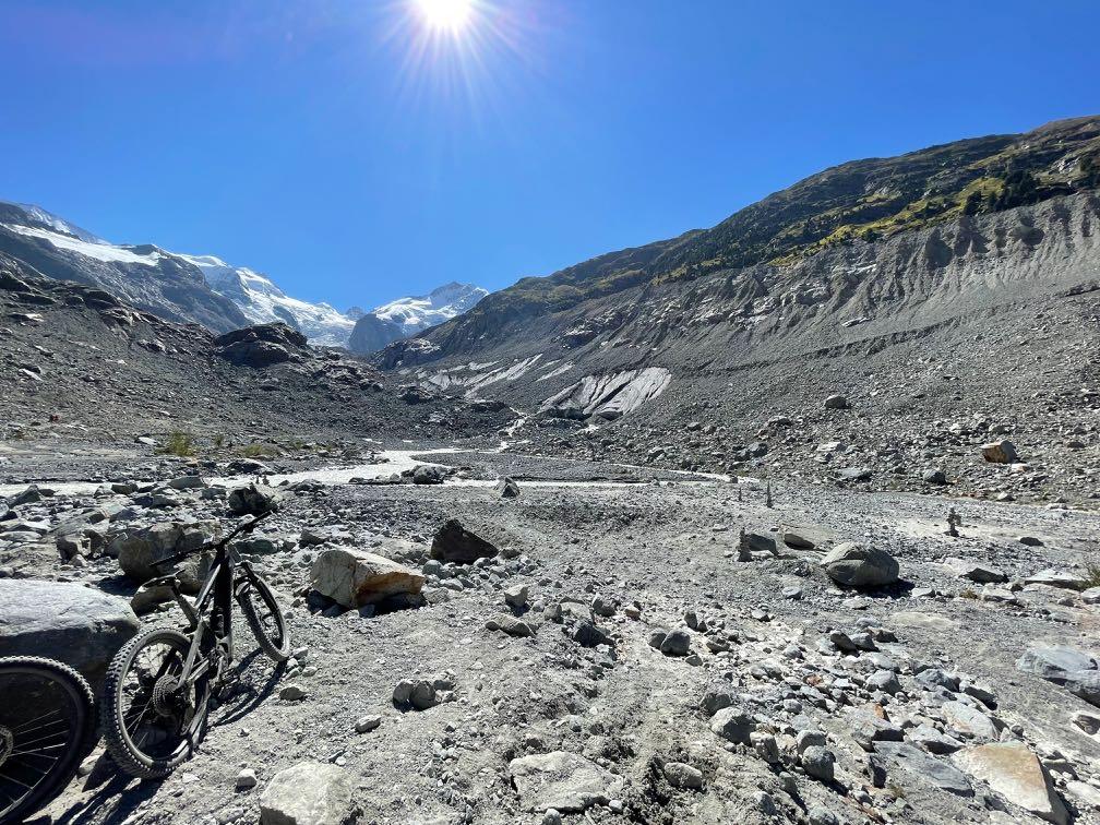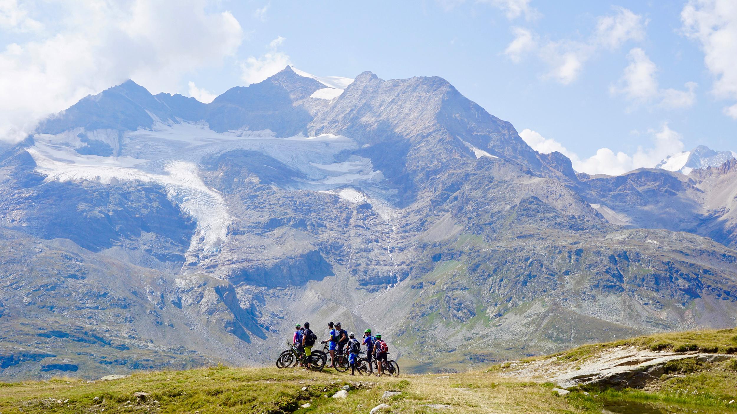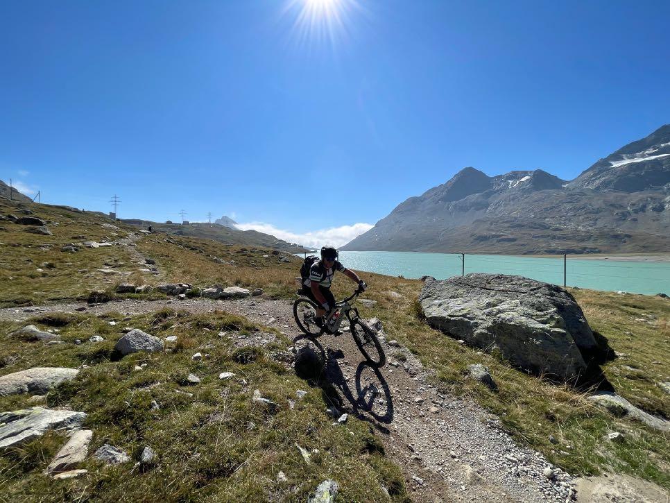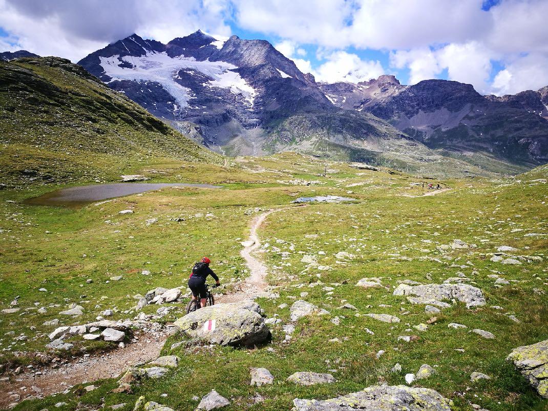 Hochalpine Bikestrecken mit Blick auf die Bernina-Gruppe.