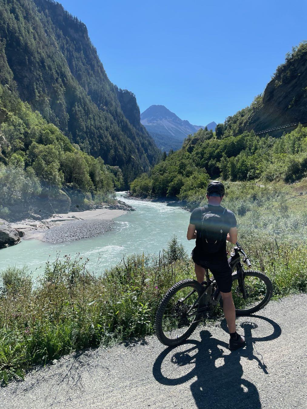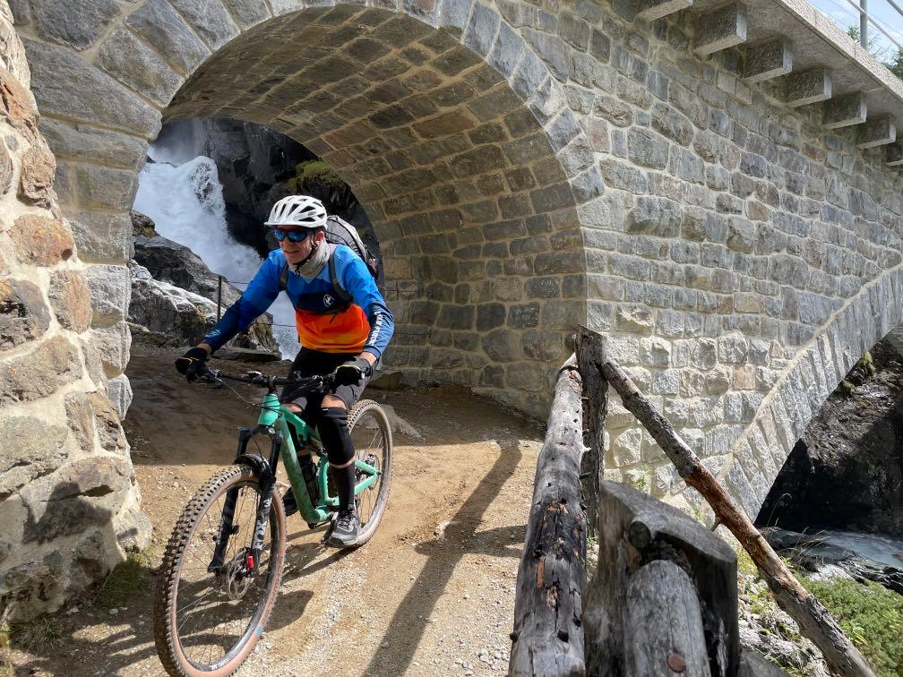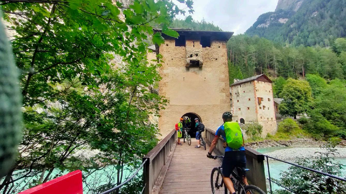 uriger Mittagsrast erreichen wir am Talgrund die Kajetansbrücke. Hier wartet ein weiteres historisches Highlight auf uns. Der Innübergang bei Altfinstermünz war über viele Jahrhunderte eine der wichtigsten Handelsruten Europas. Abenteuerlich durchbricht der wilde Fluss hier eine Engstelle zwischen den Felsen. Der Abstecher lohnt die kurze Schiebepassage danach um den höher gelegenen Innradweg zu erreichen. Wir rauschen wieder zurück in die Schweiz. Das Engadin mit seinen Bergen heißt uns willkommen. Über Schmugglerwege erreichen wir einsamste Bergregionen. Wie haben die Menschen hier wohl vor 100 Jahren gelebt? Tief unter uns liegt das enge Bett des rauschenden Inns. Kaum zu glauben, dass auch wir vor zwei Stunden noch da unten waren. Über eine herrliche Waldabfahrt erreichen wir schließlich unser Tagesziel in Nauders. Wir übernachten im 4-Sterne-Hotel mit Wellness-Landschaft und allem, was das Sportlerherz begehrt. Wieder ist Wäscheservice möglich.