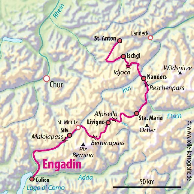 St. Anton, Ischgl, Nauders, Livigno, St.Moritz/Engadin und Comer See. Legendäre Orte mit viel Geschichte liegen am Weg. 5 Tage über 2000 Meter machen die Tour zu einem hochalpinen Highlight auf Level 2-3.