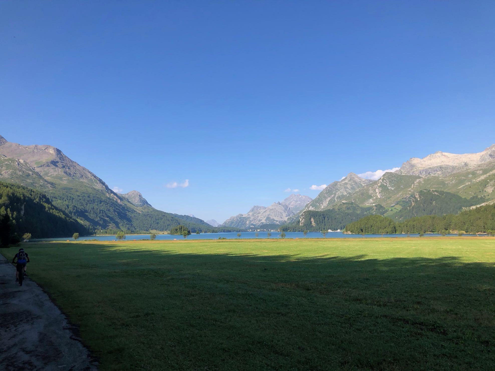 es eigentlich nur noch bergab. Wir rasten mit Blick auf Diavolezza und Bernina Gletscher und gehen mit Spaß die Abfahrt an. Diese entpuppt sich als herrlichste Mountainbikestrecke mit netten Wegen in wahrer Postkartenlandschaft. Unvermittelt taucht dann der nächste Gigant auf. Waren wir eben noch ganz auf den Weg und einige Wurzeln konzentriert, schlägt uns jetzt der gewaltige Morteratschgletscher in seinen Bann. Wir lassen uns in einer urigen Käserei den verdienten Kuchen schmecken. Der Tag könnte immer so weiter gehen. Auf schönsten Waldwegen rollen wir an Pontresina vorbei und nähern uns schnell dem mondänen St. Moritz. Erst jetzt spüren wir, dass selbst 1000 Höhenmeter ganz schön anstrengend sein können. Glücklicherweise müssen wir nur noch zwei der drei Engadiner Seen umrunden, ehe wir ausgepowert und glücklich unser Tagesziel erreichen. Ein nettes Schweizer Hotel mit allem Komfort erwartet uns in Sils.