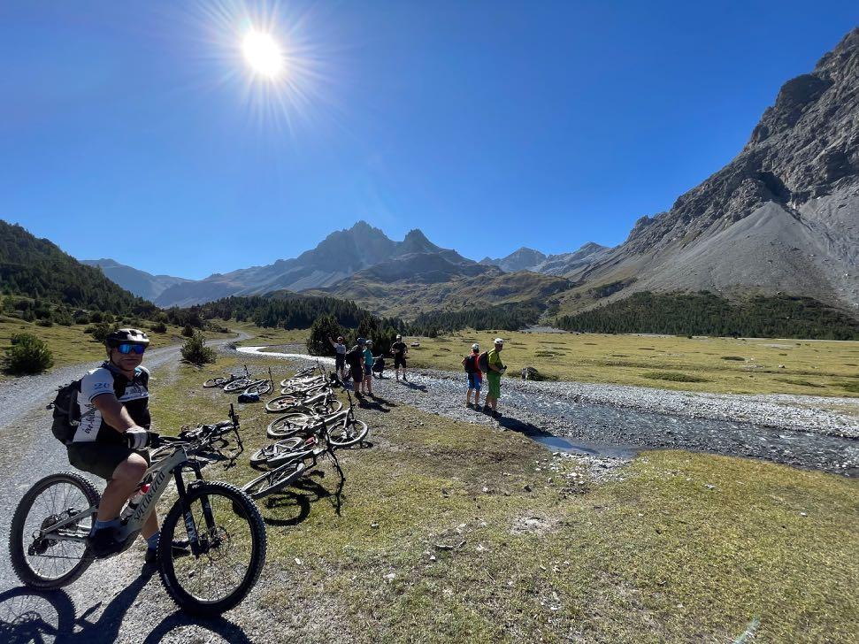 dem Lago di Cancano. Wieder taucht der Gletscher des Ortlers vor uns auf. Der Tisch ist für uns bereits in traumhafter Kulisse gedeckt. Selten haben Hüttennudeln besser geschmeckt. Wir umrunden den See und schrauben uns am Nachmittag nochmal eine Stufe höher. Spitzkehre um Spitzkehre rückt das nächste Highlight - die Alpisella - näher. Die alte Militärstrasse, ein sogenannter Dynamite-Trail, macht das Erlebnis nicht zu anstrengend. Es folgt ein knackiger Downhill auf steilstem Schotterweg und wir genießen den günstigsten Cappuccino der Tour, direkt am Bergsee bei Livigno in einer Hütte. Von hier rollen wir in Livigno ein. Ist noch Zeit für ein Eis in der Bergmolkerei, Shopping im Zollparadies oder doch lieber Entspannen im Wellness-Bereich? Wir übernachten im schicken SPA Hotel Lac Salin oder der dazugehörigen Montivas Lodge.So haben wir uns Urlaub vorgestellt.