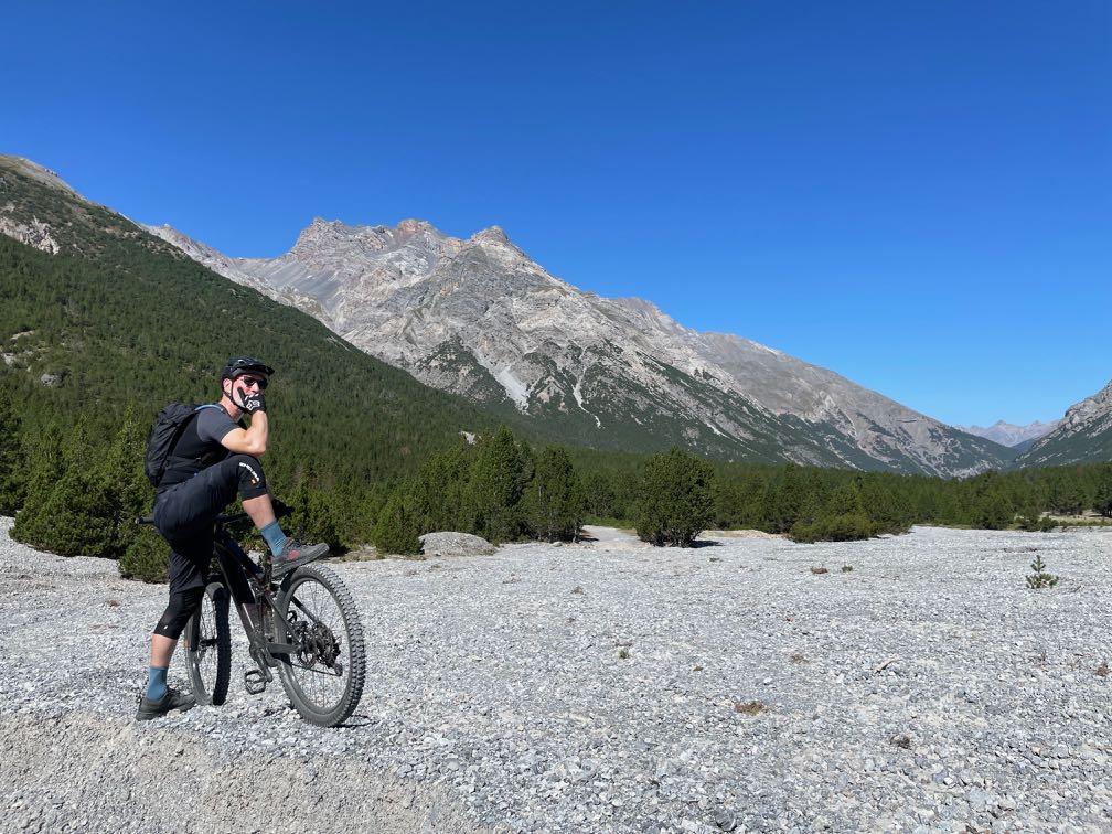 Nicht sportliche, sondern landschaftliche Höchstleistungen stehen hier ganz oben an. Trotzdem ist die Transalp Engadin eine reinras sige Mountainbike Tour mit allen MTB-Elementen. Knifflige Trail passagen müssen genauso bewältigt werden, wie lange, teils stei le Schotterabfahrten in hochalpiner Kulisse. Um die Strecke im Zeitrahmen bewältigen zu können, sind jedoch auch Straßenab schnitte und Radwege dabei. Für uns ein idealer Wegmix für be geisterte Mountainbiker, die keine Extreme suchen. Martin Riedle, ALPS Guide