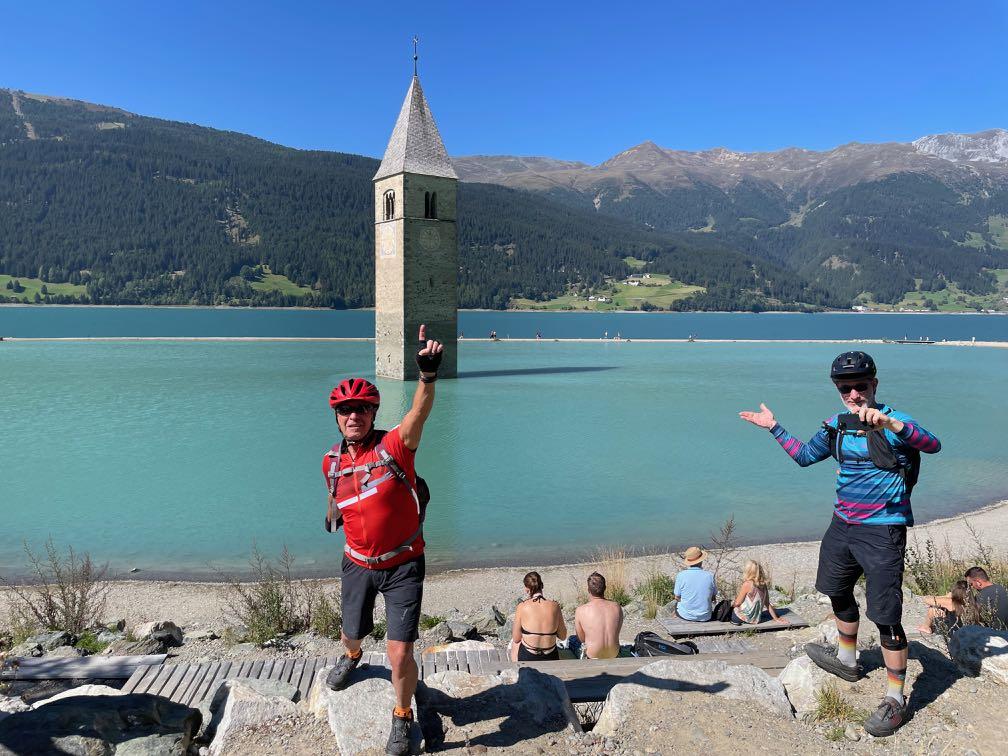 Der atemberaubende Blick auf den schneebedeckten Ortler prägt den abwechslungsreichen Biketag. Zuvor müssen wir allerdings über den Reschenpass. Wir starten auf historischem Boden. Auf der Trasse der alten Via Claudia verlassen wir jedoch bald den Radweg und treten ca. 600 hm hoch auf Bergkastell. Von dort geniessen wir Alm- und Plamorttrail zu den Panzersperren. Zum ersten Mal taucht der Ortler auf. 27 3000er-Spitzen prägen das gigantische Massiv. Der magische Berg wird uns immer wieder auch die nächsten Tage begeistern. Der Blick auf Reschen- und Haidersee mit Ortler im Hintergrund bleibt unvergessen. Am Reschensee angelangt radeln wir durch einen herrlichen Lärchenwald und brausen nur so ins Vinschgau hinab. Begeistert steuern wir das mittelalterliche Städtchen Glurns zur Mittags-