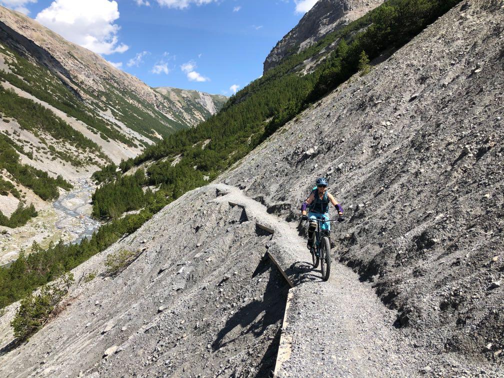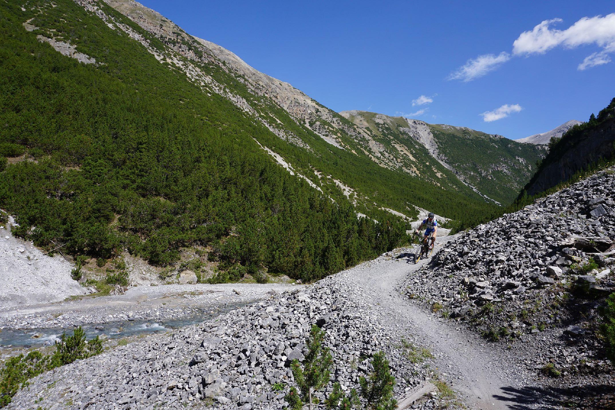Wir starten gleich mit einer Rampe. Doch in Erwartung des Tages ist jeder motiviert. Zum Glück ist das steilste Stück nur kurz und wir schleifen bald in eine moderate Schotterstrecke ein. 600 Höhenmeter am Stück gilt es darauf zu bezwingen. Am Dös Radond auf 2000 Meter Höhe ist erst einmal Riegelpause angesagt. Ohne fahrtechnische Tücken rollen wir ins Val Mora hinein. Der Weg wird dann jedoch schmal und teilweise abenteuerlich. Jahr für Jahr formt hier der Berg den Streckenverlauf neu. Begeisterte Trailfahrer haben darauf mehr als ihren Spass, andere müssen kurze Passagen schieben. Die alte Militärstrasse hoch zur Alpisella ist dann wieder moderates MTB-Terrain. Nicht zu steil, aber trotzdem knackig. Auf der Abfahrt hinunter nach Livigno sind dann gute Bremsen, Geschick und Konzentration gefragt. Der Weg ist zwar breit, doch auf der steilen Strecke kommen lose Steine gern ins Rollen. Vorsicht ist angesagt.