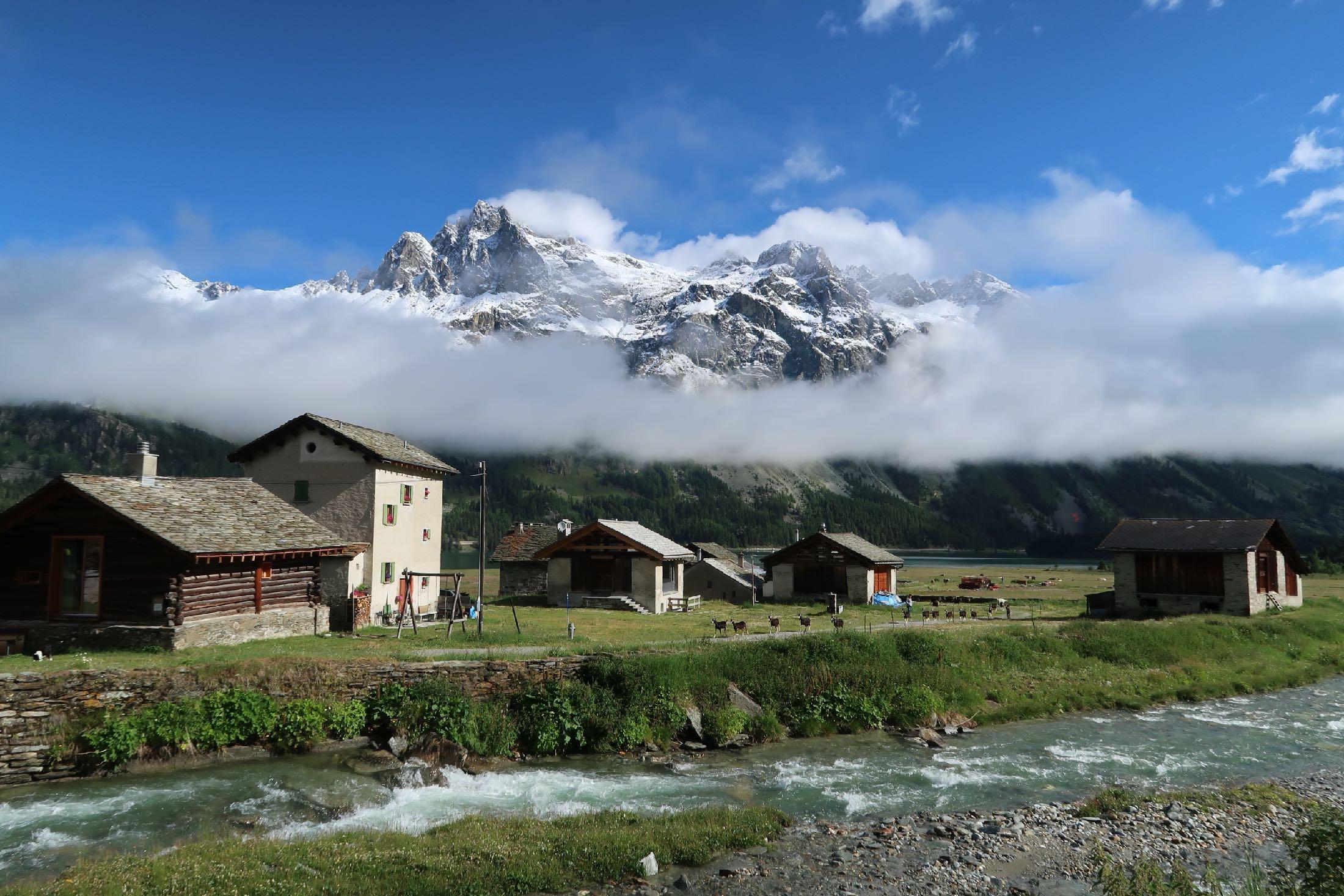 Wieder wachen wir vor traumhafter Bergkulisse auf. So sollte jeder Morgen beginnen. Noch unberührt ist die spiegelnde Wasserfläche des Silser Sees, wenn wir mit unseren Rädern starten. Hoch über uns stürzt der junge Inn mit einem imposanten Wasserfall herab. Wir begreifen warum der Alpentourismus von hier vor mehr als 200 Jahren seinen Anfang nahm und warum Filmemacher immer wieder hierher gezogen werden. Wir erklimmen den Maloja-Pass beinahe gänzlich ohne Höhenmeter. Von nun an geht's bergab. Auf einem Mix aus Asphaltstrecken und uralten, versteckten Karrenpfaden arbeiten wir uns hinab ins Bergell. Die Ortschaften haben plötzlich einen ganz anderen Charakter, auch die Berge sind