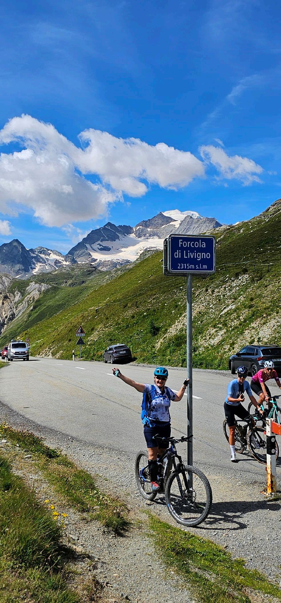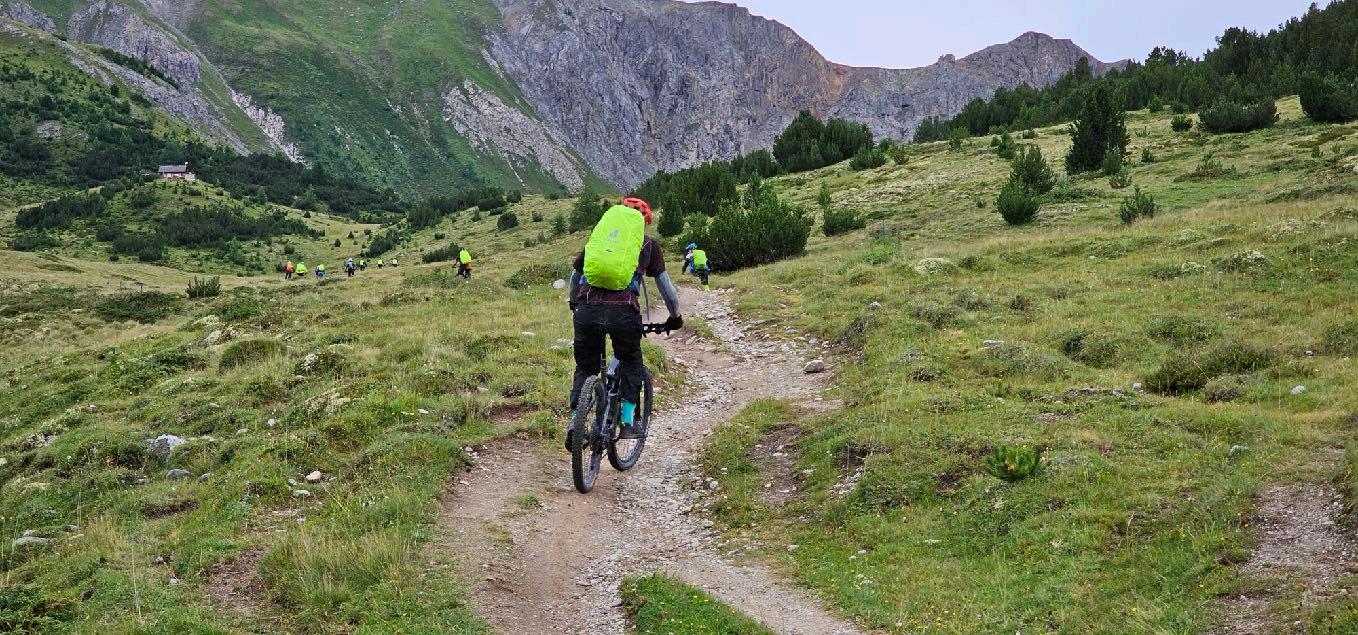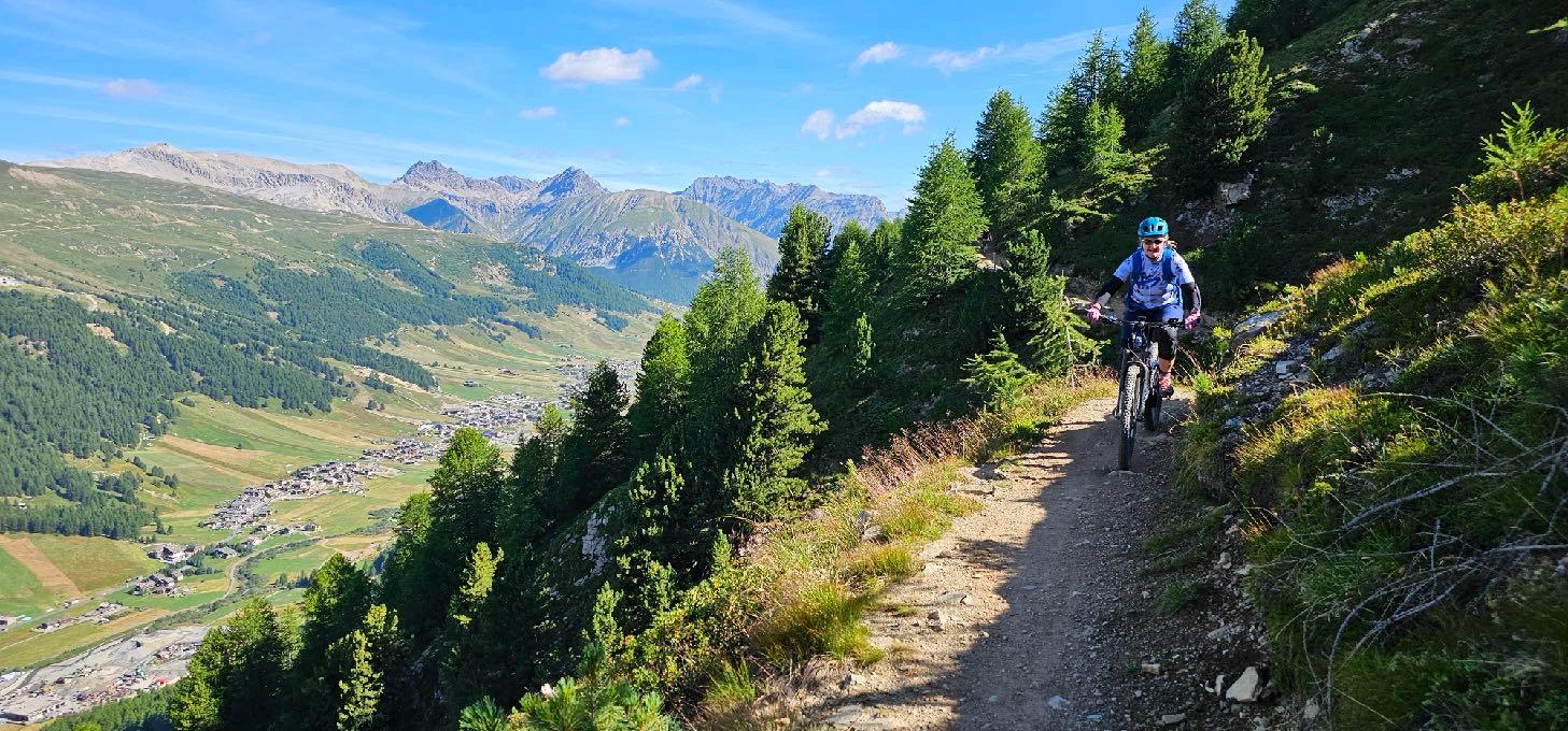 Wir starten gleich mit einer Rampe. Doch in Erwartung des Tages ist jeder motiviert. Zum Glück ist das steilste Stück nur kurz und wir schleifen bald in eine moderate Schotterstrecke ein. 600 Höhenmeter am Stück gilt es darauf zu bezwingen. Am Döss Radond auf 2000 Meter Höhe ist erst einmal Riegelpause angesagt. Ohne fahrtechnische Tücken rollen wir ins Val Mora hinein. Danach queren wir zum Passo Gallo. Begeisterte Trailfahrer haben dann mehr als ihren Spass, andere müssen kurze Passagen schieben. Die alte Militärstraße hoch zum Passo Trela ist teilweise gemein steil. Die Abfahrt hinunter nach Livigno ist dann nur noch Fahrspaß pur. Manche sprechen vom "never ending Singletrail". Danke an Hans "Noway" Rey, er hat dieses Meisterwerk für uns Mountainbiker gebaut.