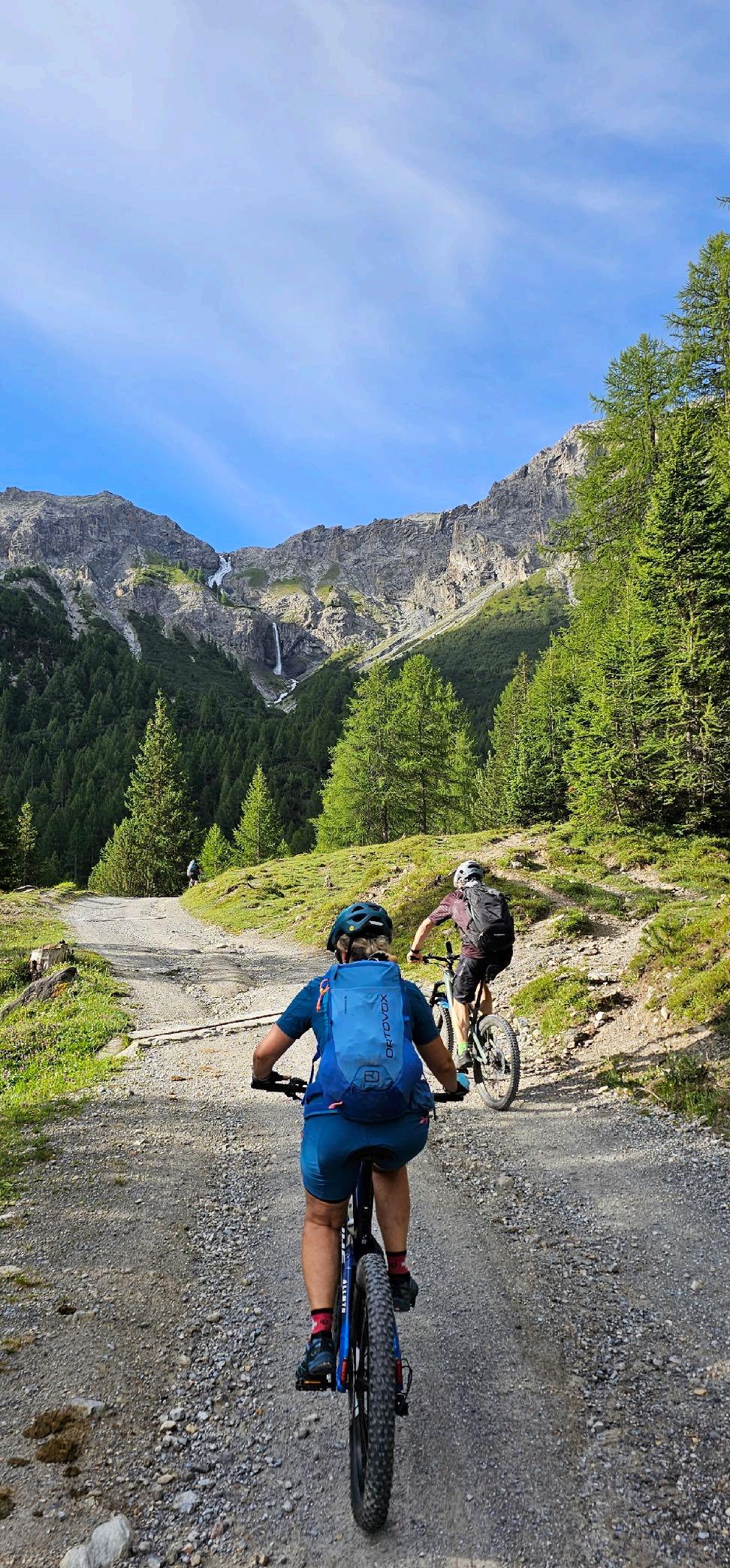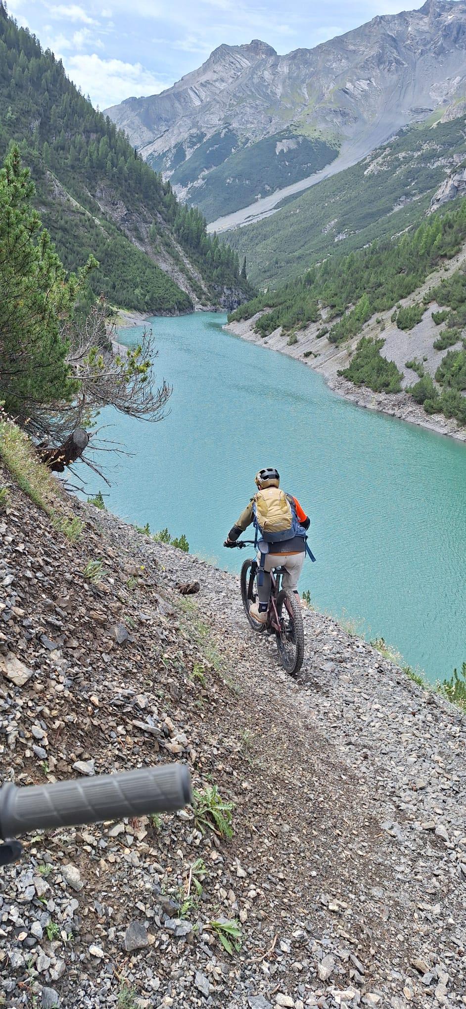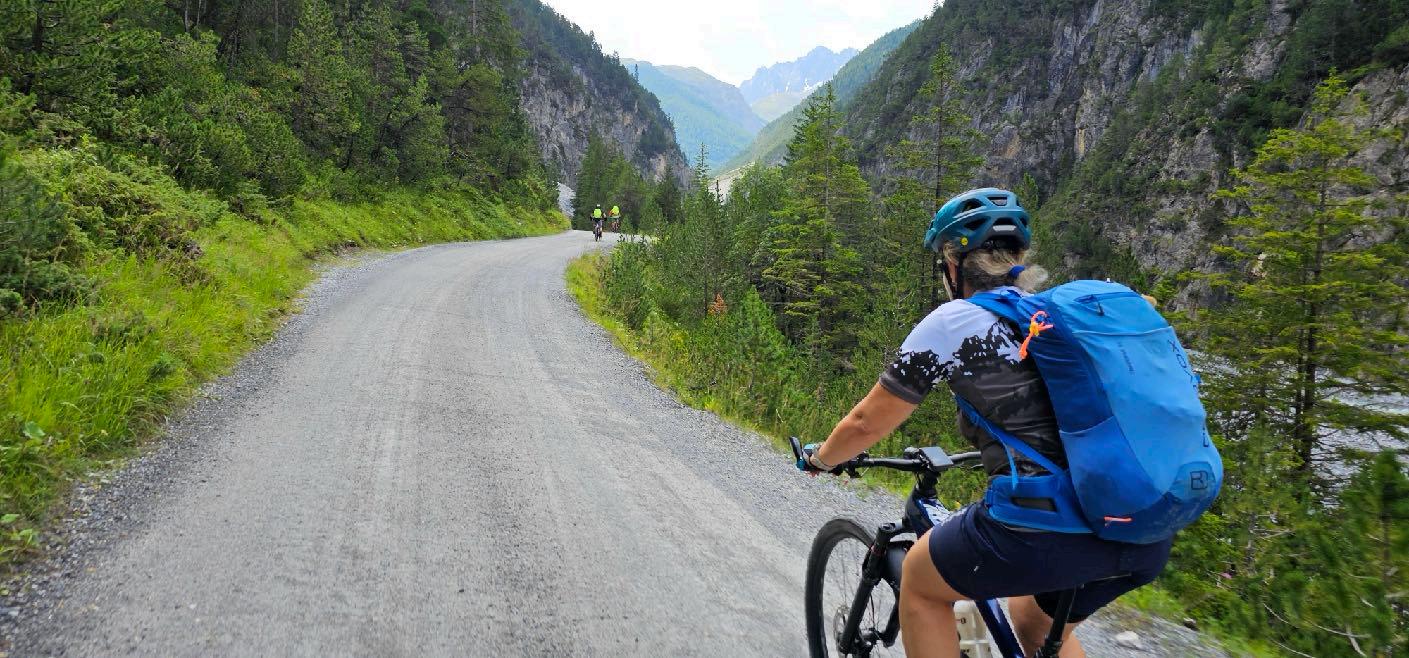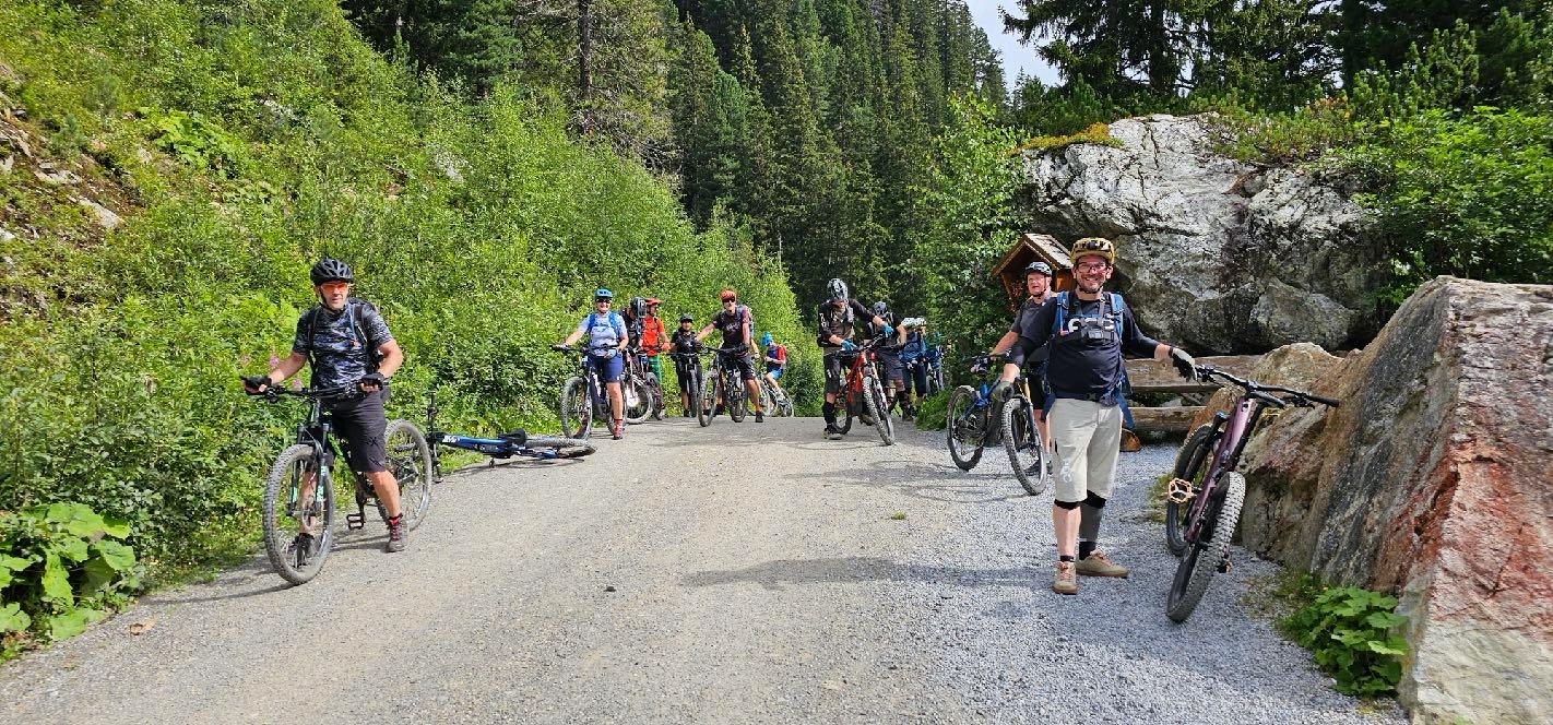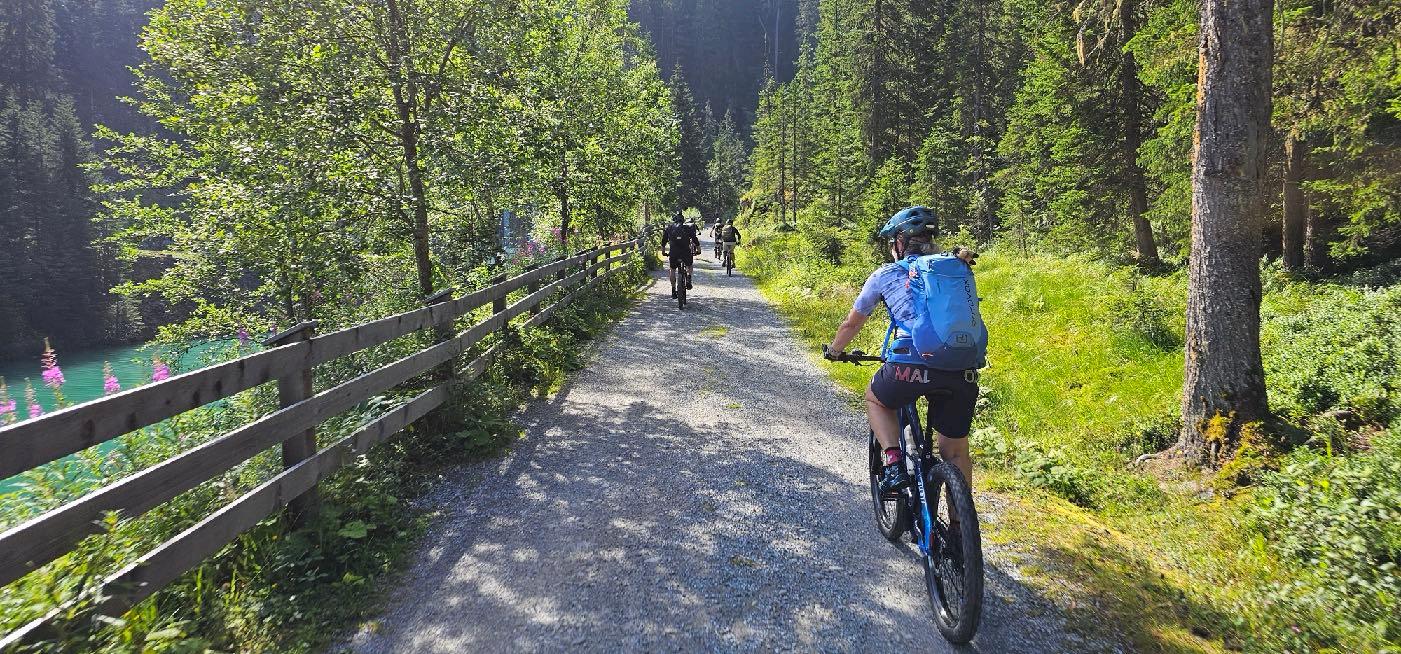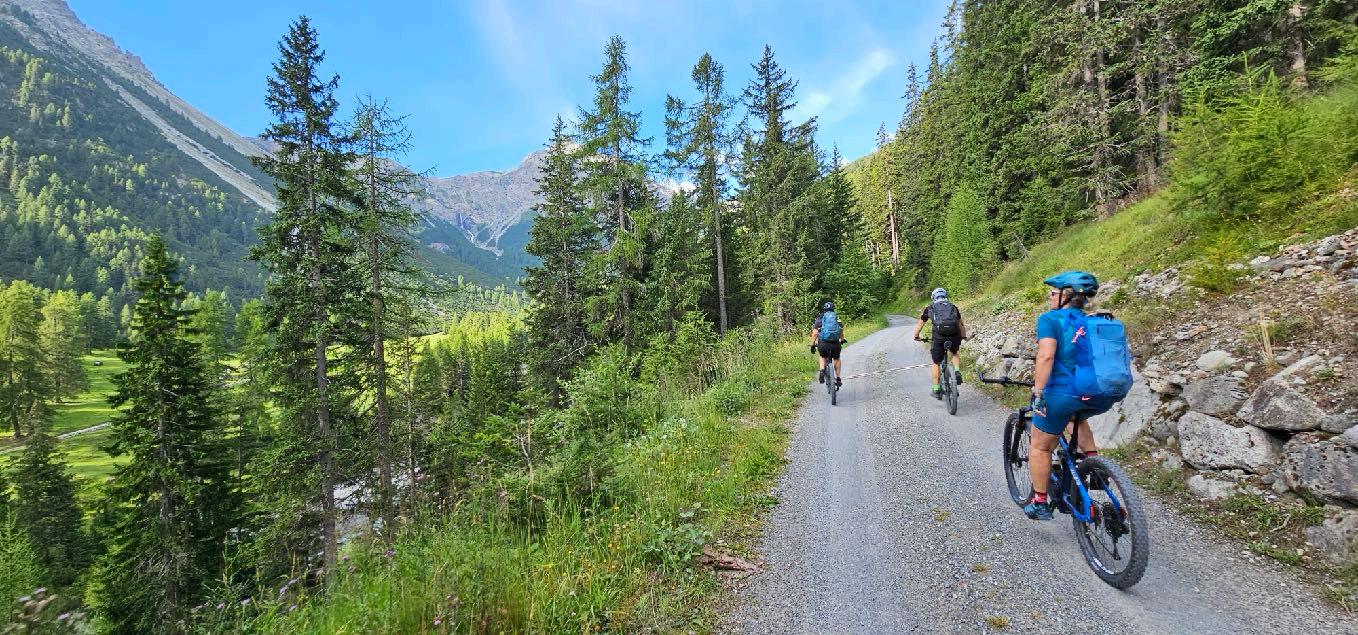 So könnte jeder Morgen beginnen. Ein herrlicher Schotterweg mit moderater Steigung führt ins Verwalltal hinein. Doch der Genuß hat eine dreiviertel Stunde vor der Mittagspause ein jähes Ende. Gut 20 Minuten schieben stehen an. Am Hochplateau entschädigt uns jedoch gleich ein netter Singletrail. Nach der Mittagspause geht es zunächst auf breiten Schotterwegen teils steil bergab. Dann folgt die zweite fahrtechnische Herausforderung. Fahrbar oder nicht fahrbar? Der anschließende Höhentrail zum Zeinissee ist auf jeden Fall gut fahrbar. Die letzten Kilometer nach Ischgl sind mit einem erneuten Anstieg auf einem Waldtrail gewürzt. Auf herrlich weichen Waldwegen rauschen wir dann direkt in unser Hotel.
