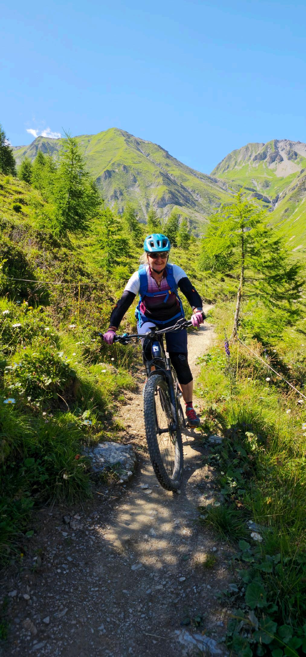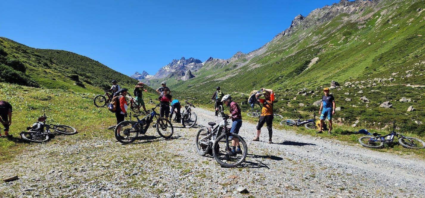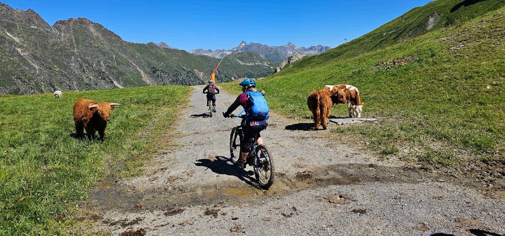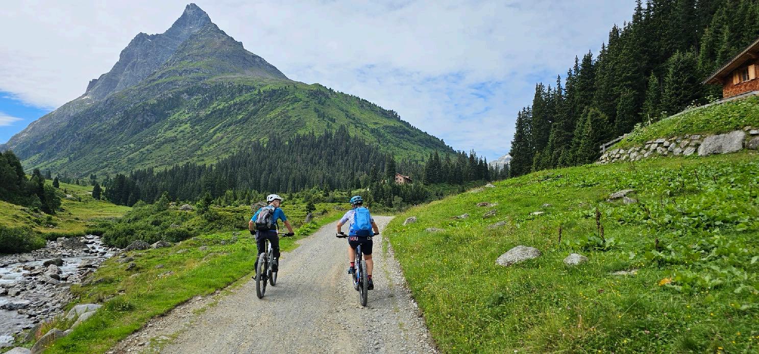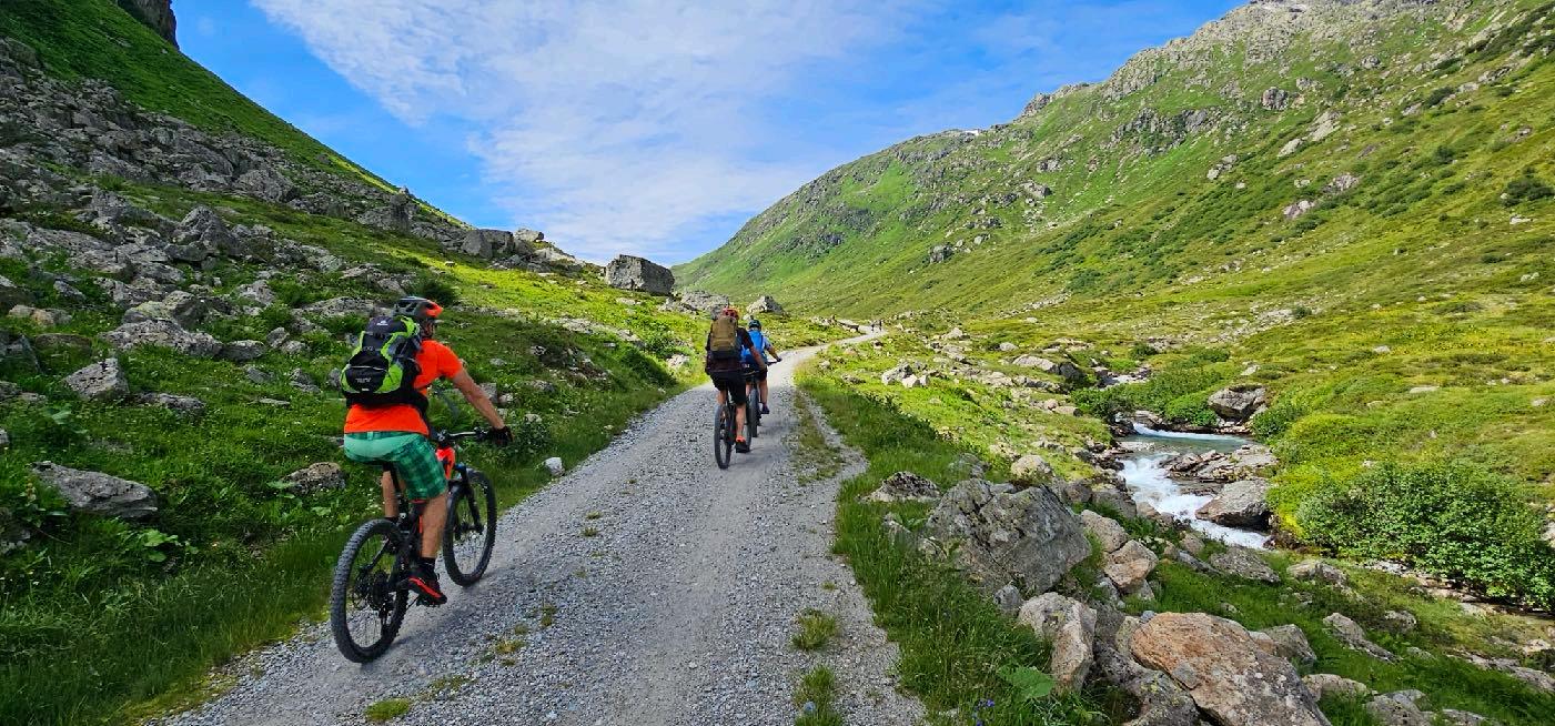 So könnte jeder Morgen beginnen. Ein herrlicher Schotterweg mit moderater Steigung führt ins Verwalltal hinein. Doch der Genuß hat eine dreiviertel Stunde vor der Mittagspause ein jähes Ende. Gut 20 Minuten schieben stehen an. Am Hochplateau entschädigt uns jedoch gleich ein netter Singletrail. Nach der Mittagspause geht es zunächst auf breiten Schotterwegen teils steil bergab. Dann folgt die zweite fahrtechnische Herausforderung. Fahrbar oder nicht fahrbar? Der anschließende Höhentrail zum Zeinissee ist auf jeden Fall gut fahrbar. Die letzten Kilometer nach Ischgl sind mit einem erneuten Anstieg auf einem Waldtrail gewürzt. Auf herrlich weichen Waldwegen rauschen wir dann direkt in unser Hotel.
