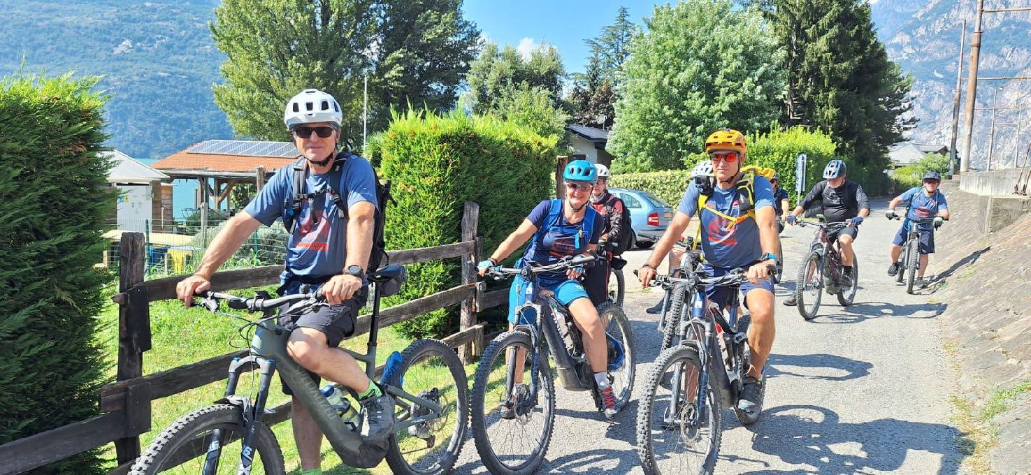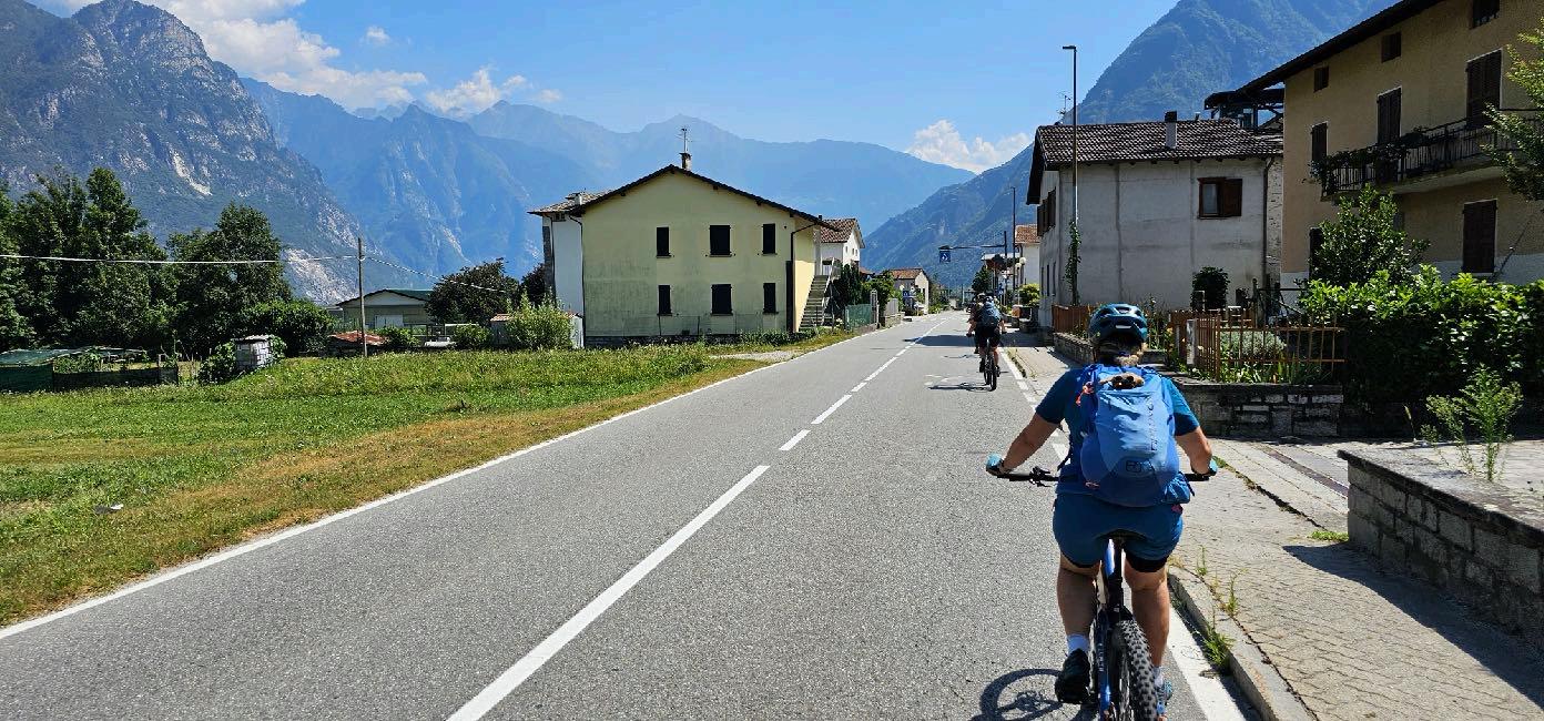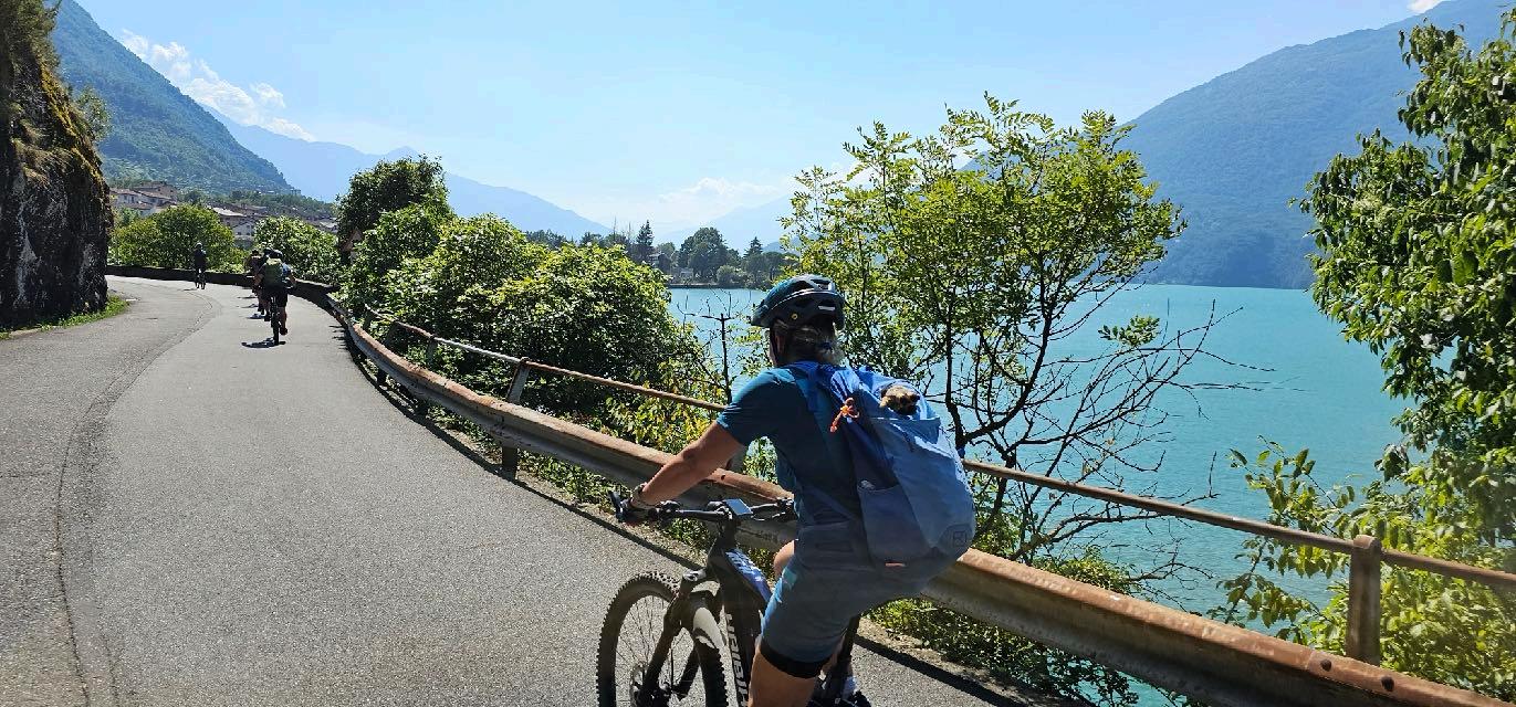 auf legendäre Kletterwände. Vorbei an einem Wasserfall, über kleine Brücken erreichen wir die Grenze. Italienischer Lebensstil hüllt uns ein. So ist nach der Mittagsrast bei Chiavenna als erstes ein Stopp in der ersten italienischen Eisdiele angesagt. Der Comer See rückt immer näher. Zum Glück haben die Italiener hier ganz neu schöne Radwege gebaut. So können wir selbst die letzten Meter völlig ohne Verkehr genießen. Im Abendlicht erreichen wir das mediterrane Klima des Comer Sees. Wir haben es geschafft! Unser Hotel liegt im verkehrsberuhigten Kern von Colico direkt am See. Eine nette Bar zum Feiern ist schnell gefunden. Wir genießen ein letztes gemeinsames Abendessen am See.