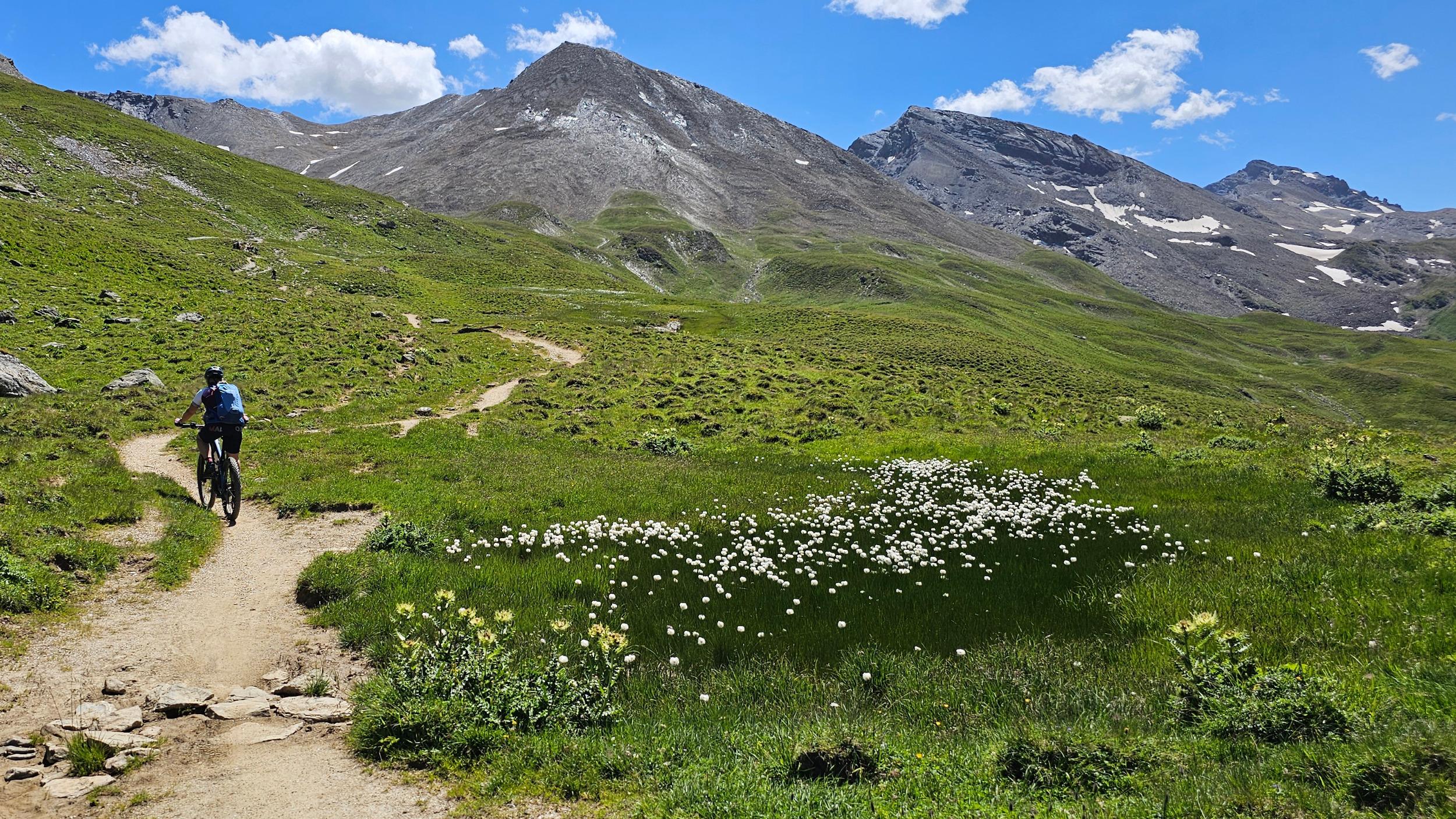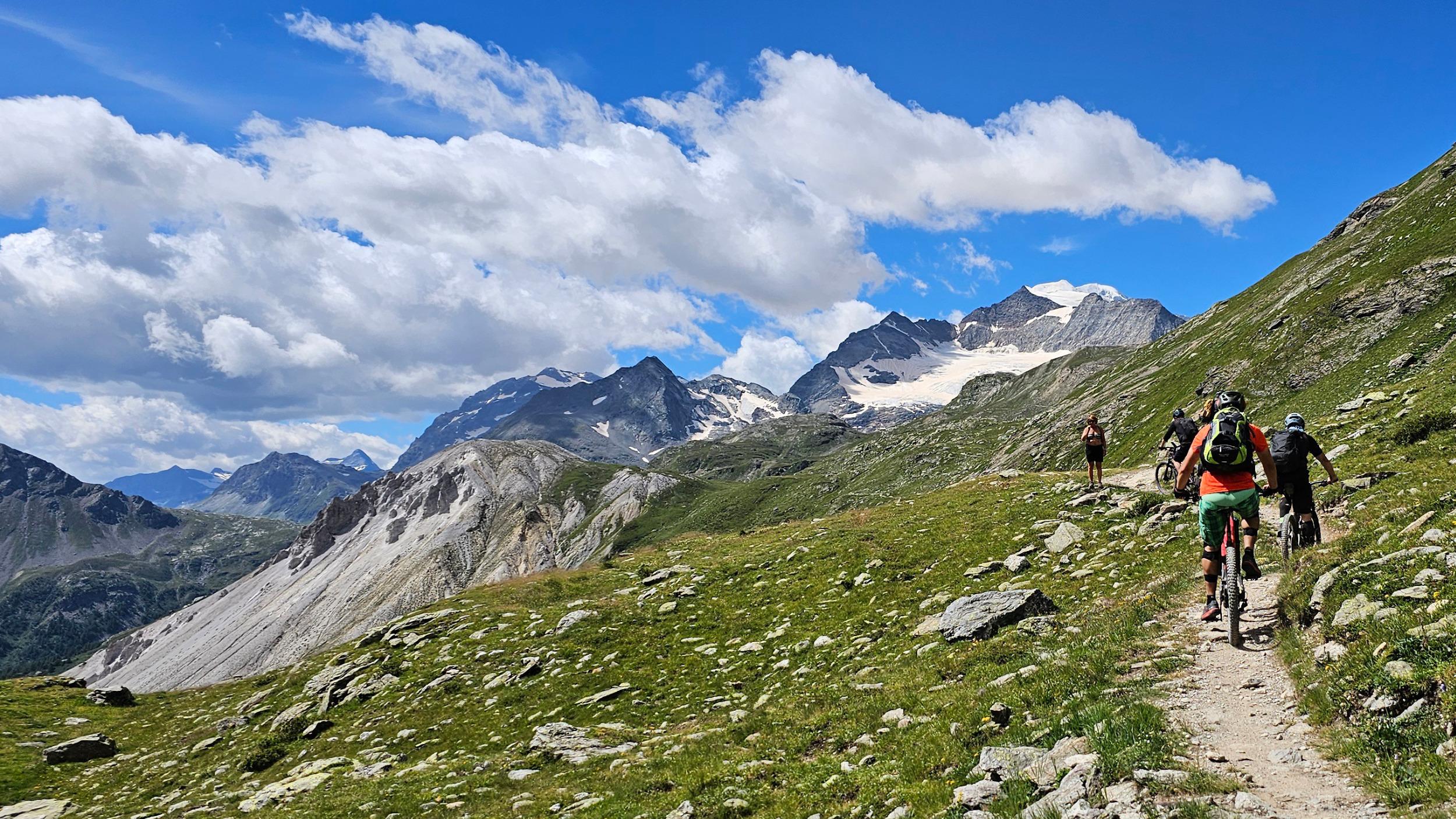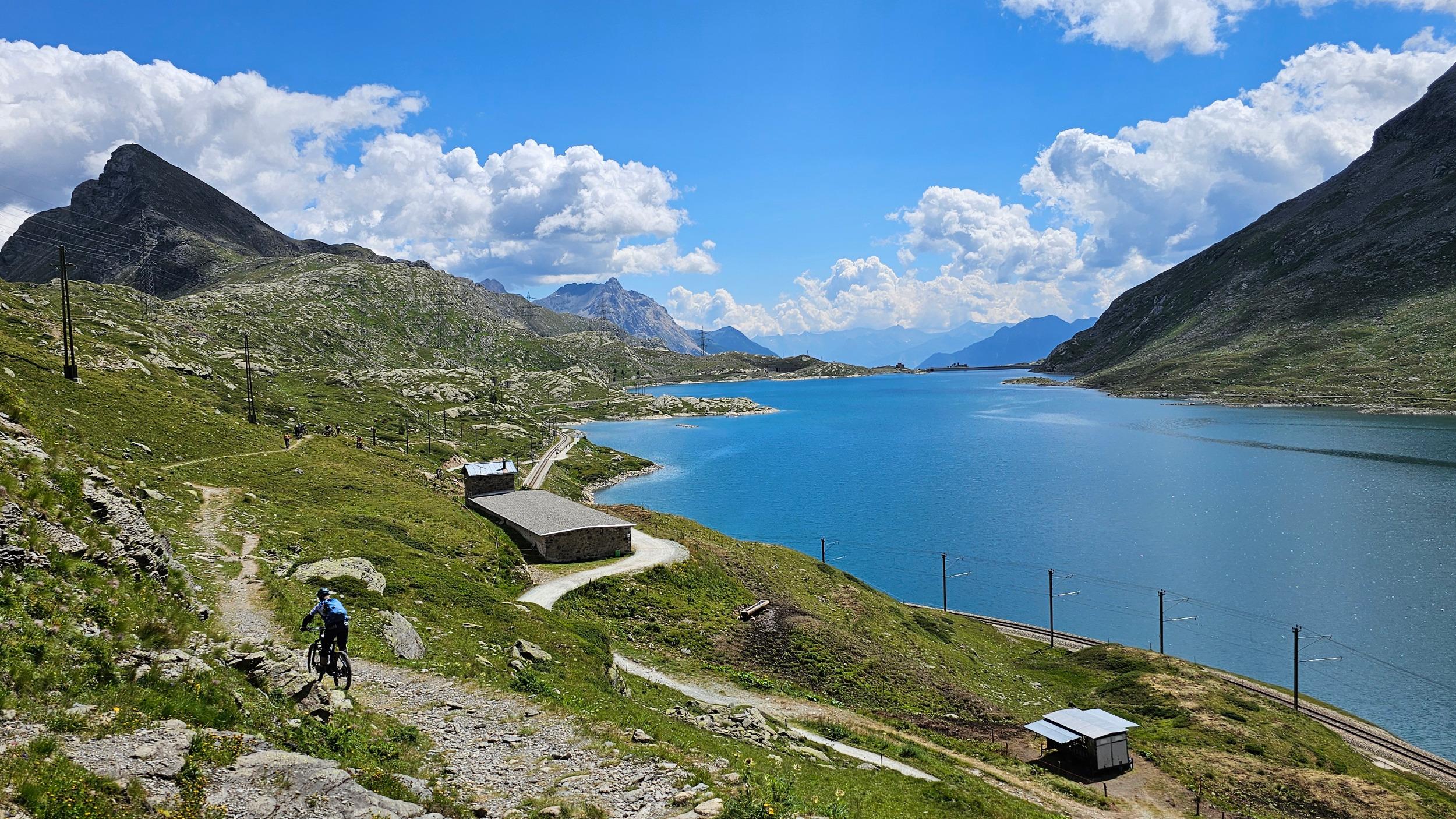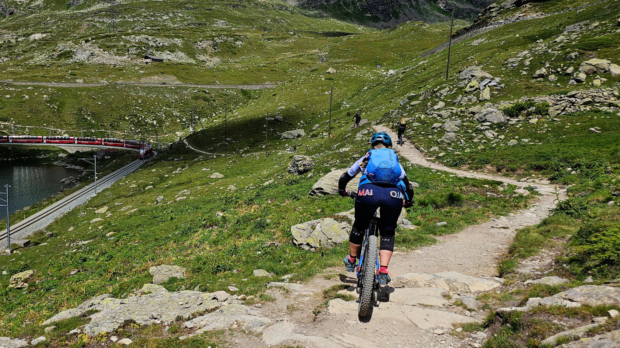 Auf neu gebauten Bikepark-Wegen geht es teils technisch und schweißtreibend gut 200 Höhenmeter weiter hoch bis zur Forcola Minor. Der knapp einstündige Anstieg kostet Kraft, lohnt aber jede Mühe. Der Ausblick ist gigantisch. Direkt vor uns ragt der Bernina Gletscher auf, tief unter uns liegen die zwei Gletscherseen. Der legendäre Bernina-Express gleicht von hier oben einer Spielzeug-Eisenbahn. Es folgt