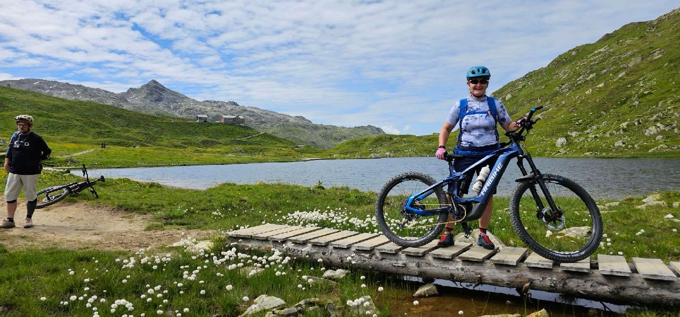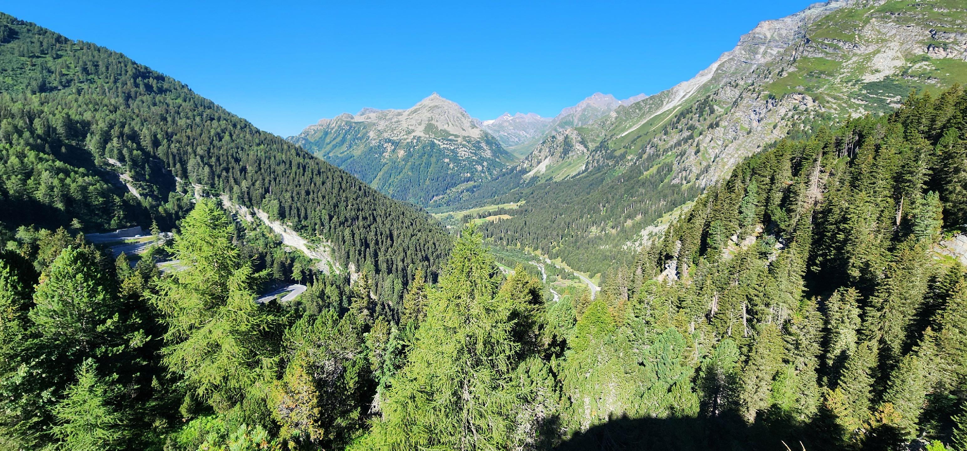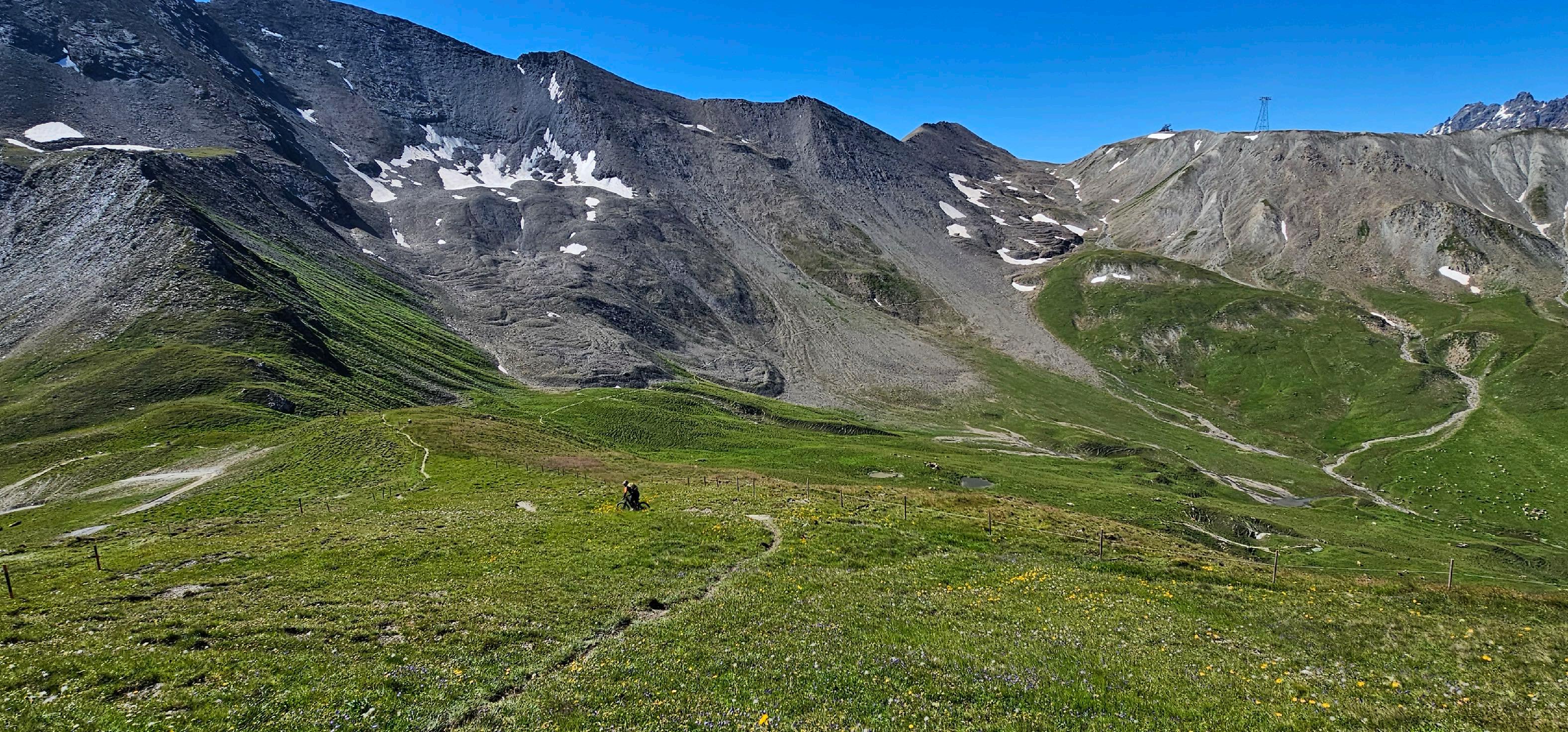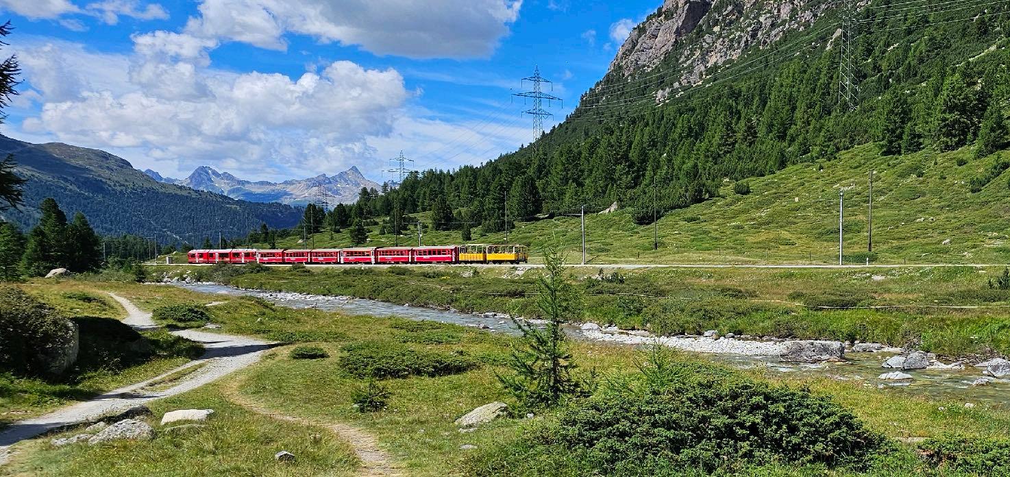Auf neu gebauten Bikepark-Wegen geht es teils technisch und schweißtreibend gut 200 Höhenmeter weiter hoch bis zur Forcola Minor. Der knapp einstündige Anstieg kostet Kraft, lohnt aber jede Mühe. Der Ausblick ist gigantisch. Direkt vor uns ragt der Bernina Gletscher auf, tief unter uns liegen die zwei Gletscherseen. Der legendäre Bernina-Express gleicht von hier oben einer Spielzeug-Eisenbahn. Es folgt
