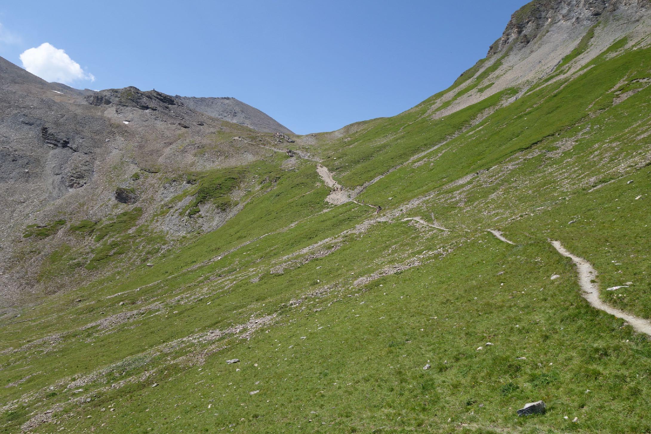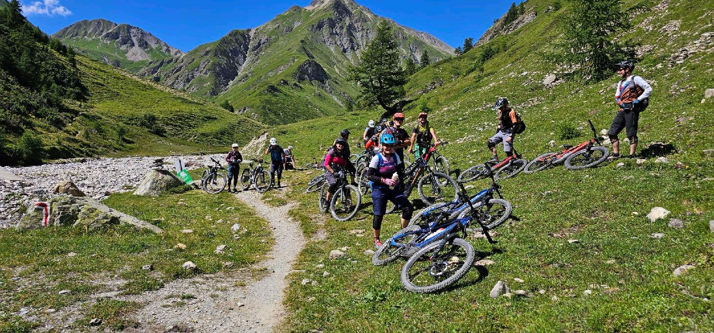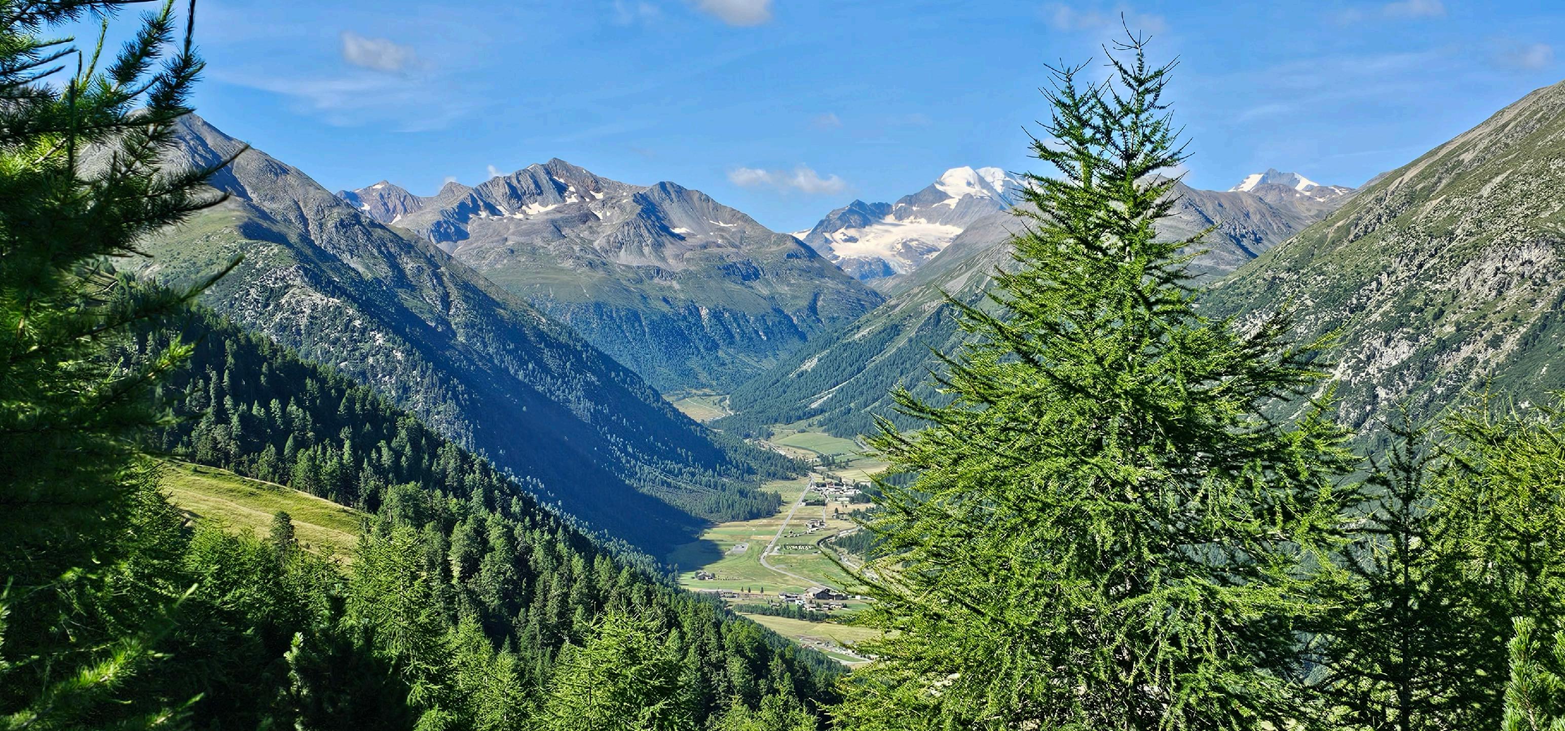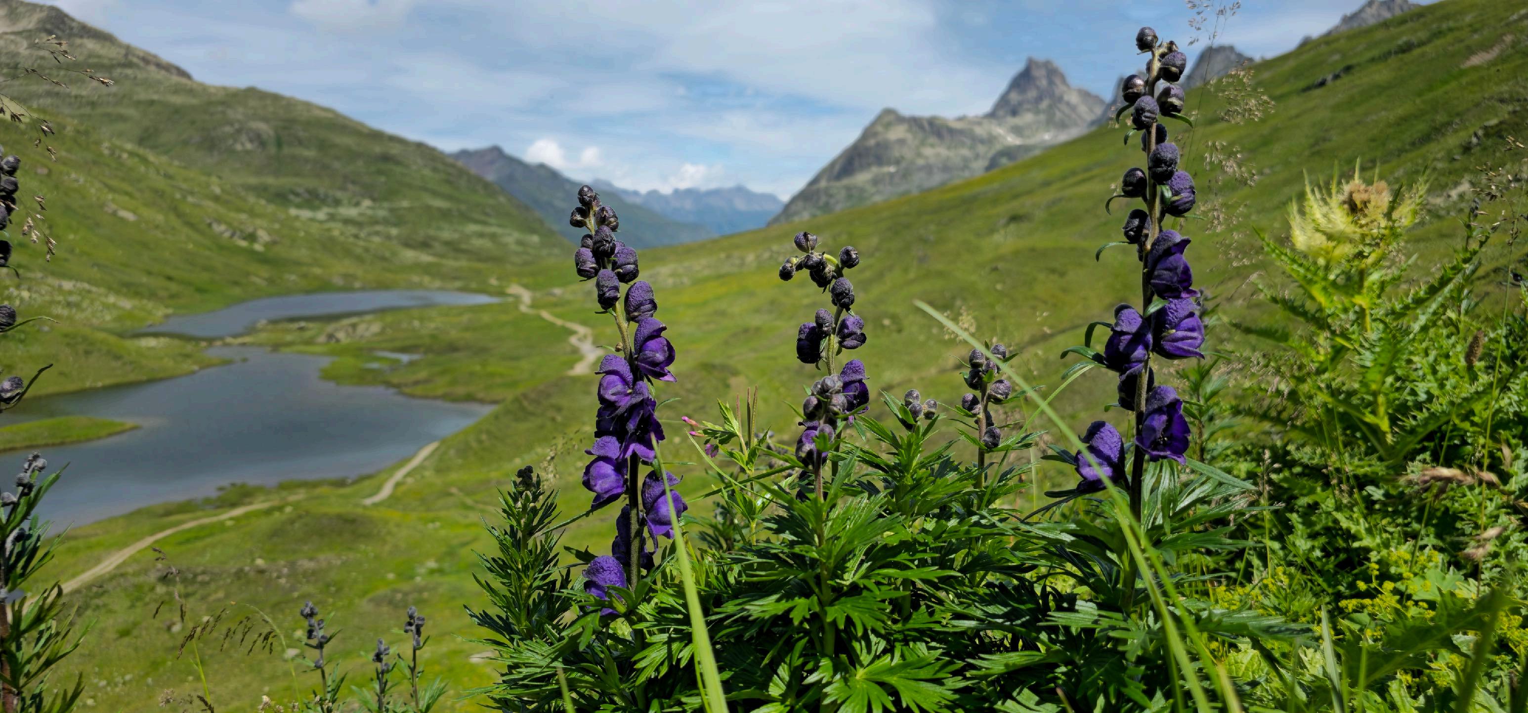 Auf neu gebauten Bikepark-Wegen geht es teils technisch und schweißtreibend gut 200 Höhenmeter weiter hoch bis zur Forcola Minor. Der knapp einstündige Anstieg kostet Kraft, lohnt aber jede Mühe. Der Ausblick ist gigantisch. Direkt vor uns ragt der Bernina Gletscher auf, tief unter uns liegen die zwei Gletscherseen. Der legendäre Bernina-Express gleicht von hier oben einer Spielzeug-Eisenbahn. Es folgt