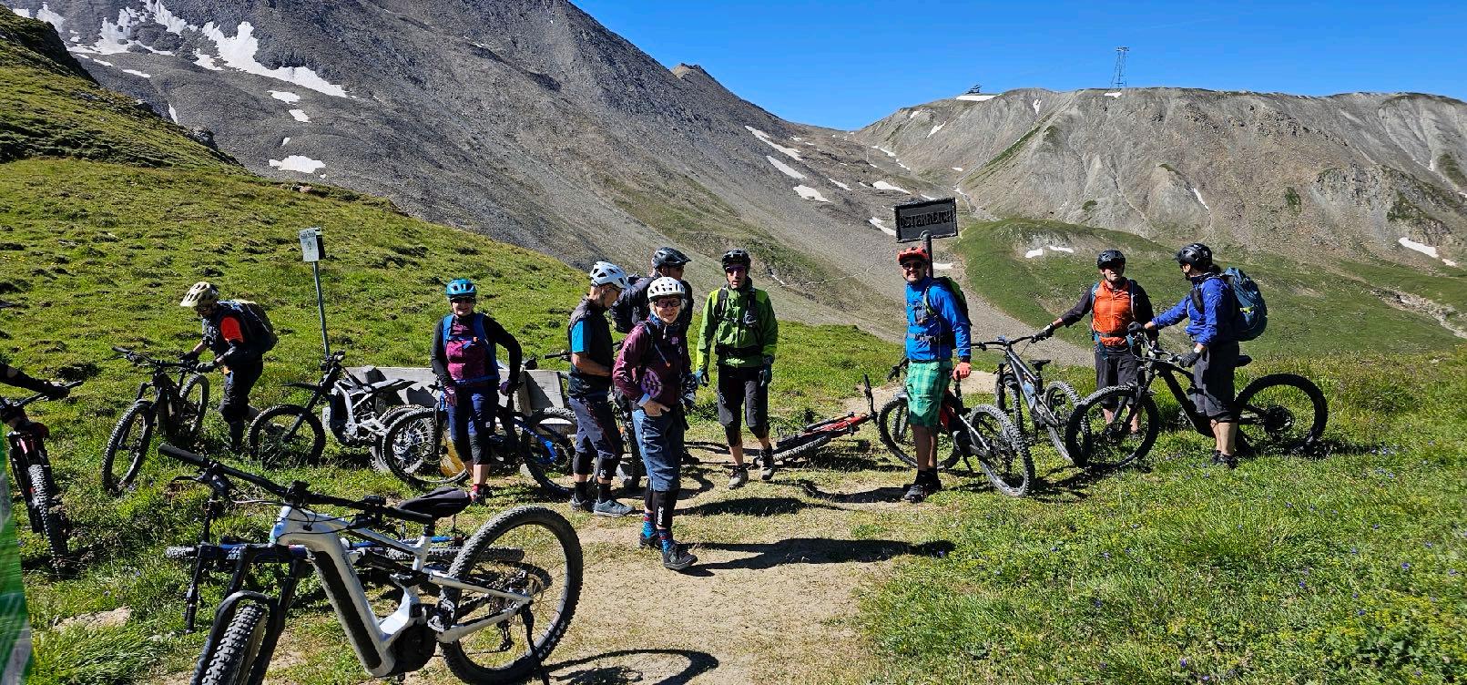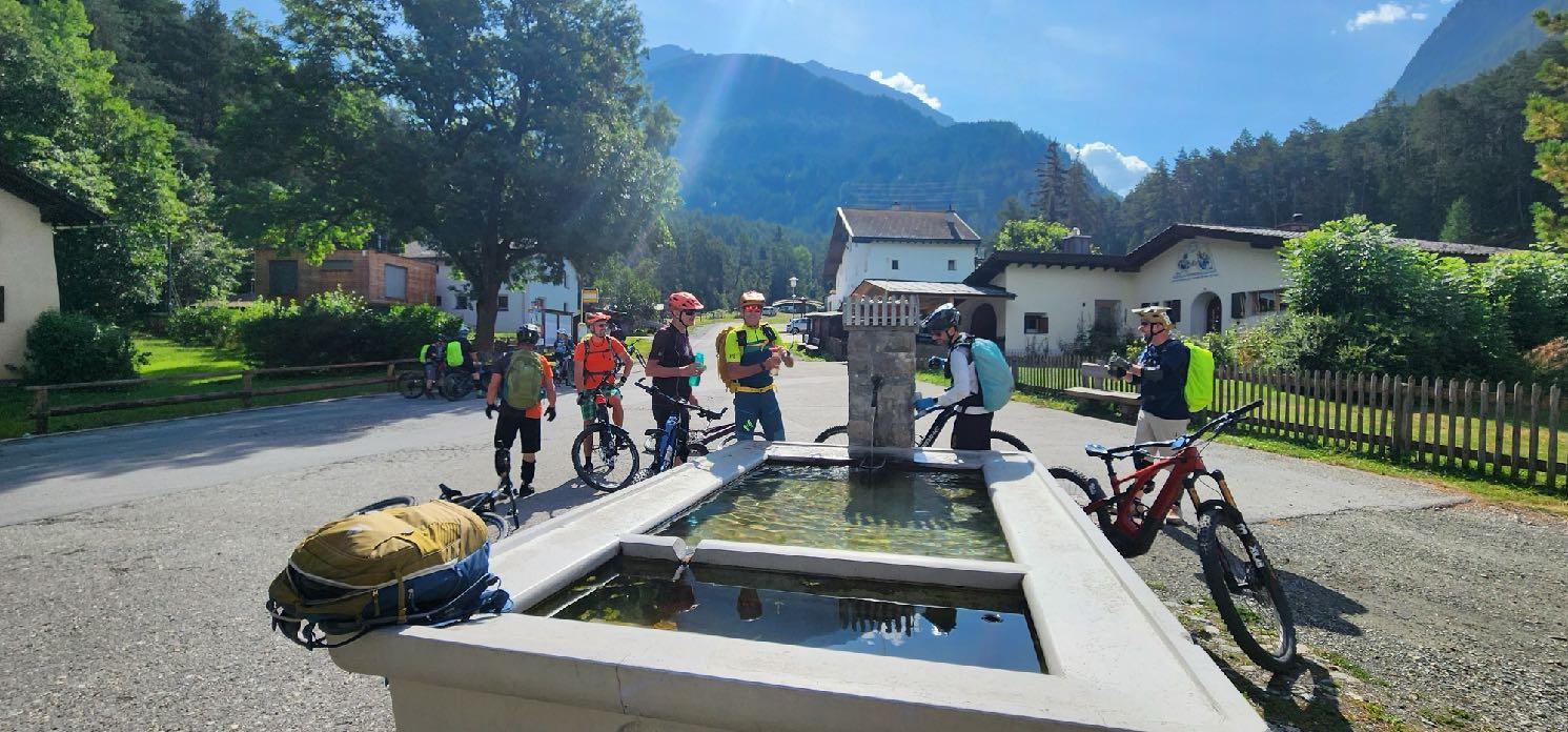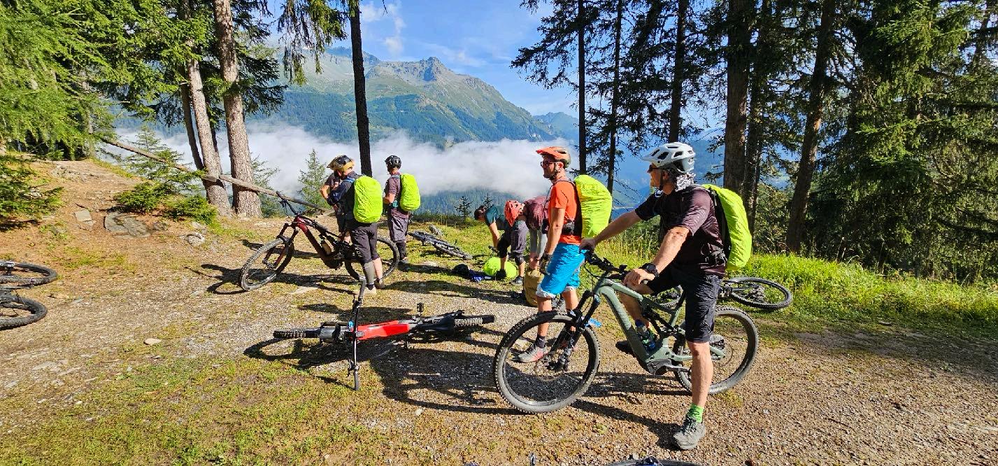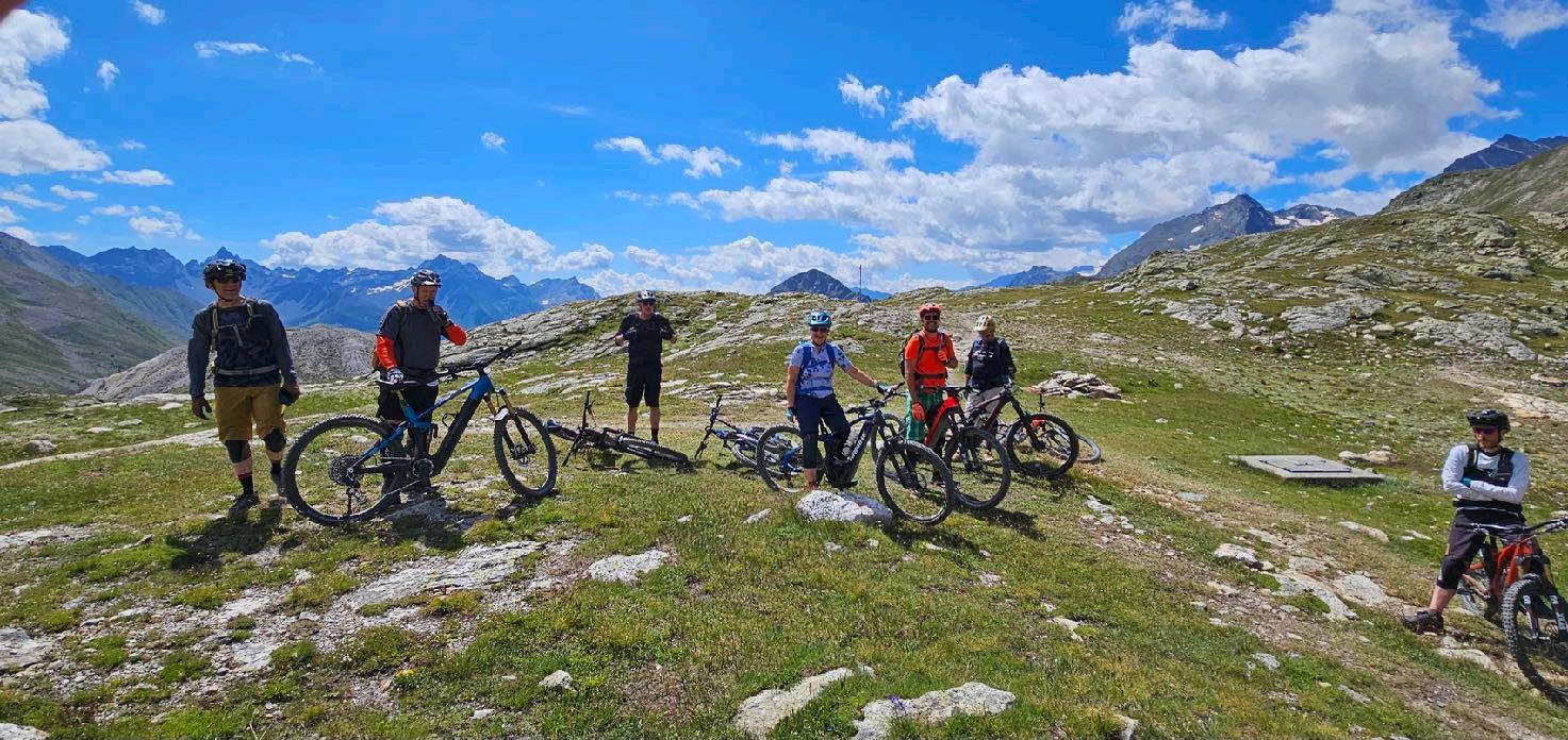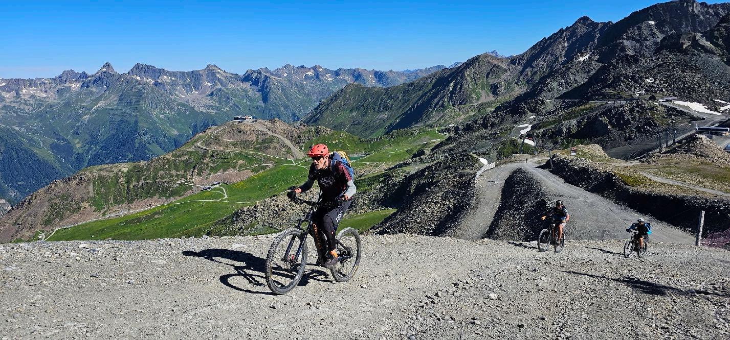 Diesen Tag wird keiner so schnell vergessen. Die Stein- und Trailwüsten des Alpenhauptkammes erwarten uns. Schnell bringt uns die Seilbahn auf 2700 Meter Höhe. Das Idjoch ist unser eigentlicher Start. Die Trails um Zeblasjoch und Fimbapass fordern dann höchste Kraft und Konzentration. Mehr hochalpines Bergpanorama ist kaum möglich. Wir blicken weit hinein in die Samnaun- und Sesvenna-Gruppe. Wir sind dem Alpenhauptkamm ganz nah. Unvergeßliche Blicke werden frei. Nach tollen und anspruchsvollen Trails erreichen wir die Heidelberger Hütte. Wir genießen beste Tiroler Hüttenkost. Danach geht es auch schiebend weiter bergauf. Bei knapp 2800 Metern ist dann erstmal Schluss. Wir atmen tief durch und genießen. Nicht selten liegt hier oben selbst im Sommer Schnee. Das Panorama ist in jedem Fall überwältigend. Über teils knifflige, anstrengende Trails tasten wir uns tief hinunter nach Ramosch. Wer Spitzkehren beherrscht, ist hier klar im Vorteil. Bei der Mittagspause wurden die Kohlenhydratspeicher mit allerlei Leckereien bestens gefüllt. Somit bleibt noch Energie für den Nachmittagsanstieg. Unten im Inntal, überqueren die Grenze zur Schweiz und atmen tief durch für den letzten Anstieg zum Schwarzsee hoch über Nauders. Bevor wir erschöpft, aber begeistert die Annehmlichkeiten des Hotels genießen können, warten noch allerlei Trailschmankel auf uns. So könnte jeder Mountainbiketag aussehen.