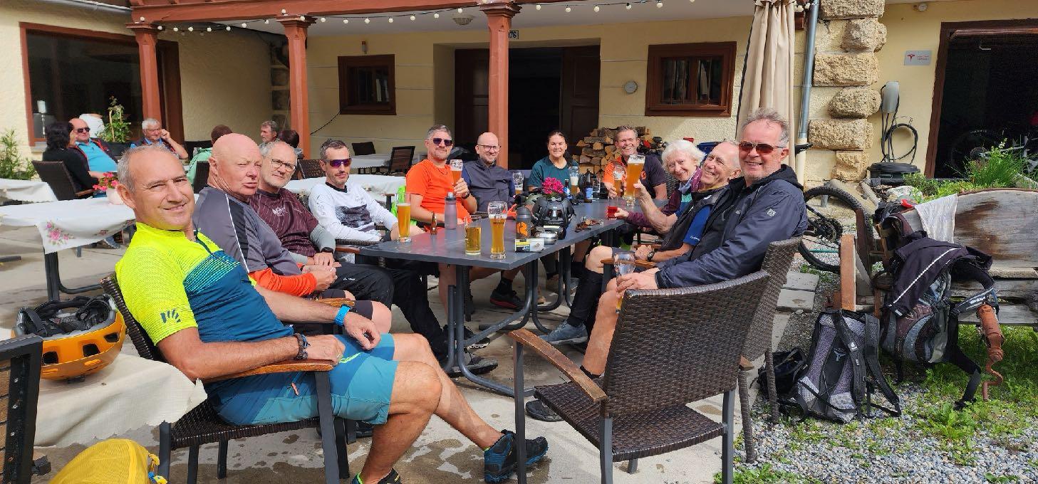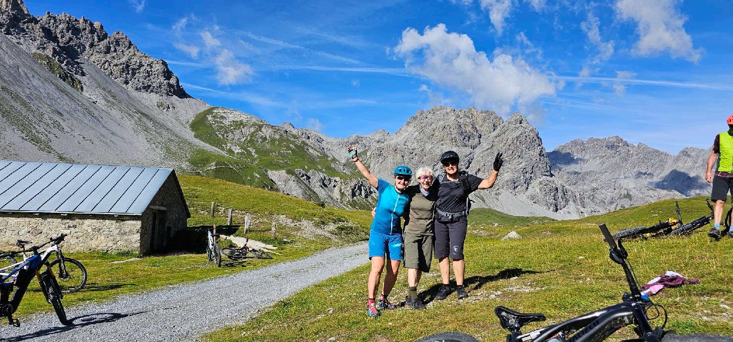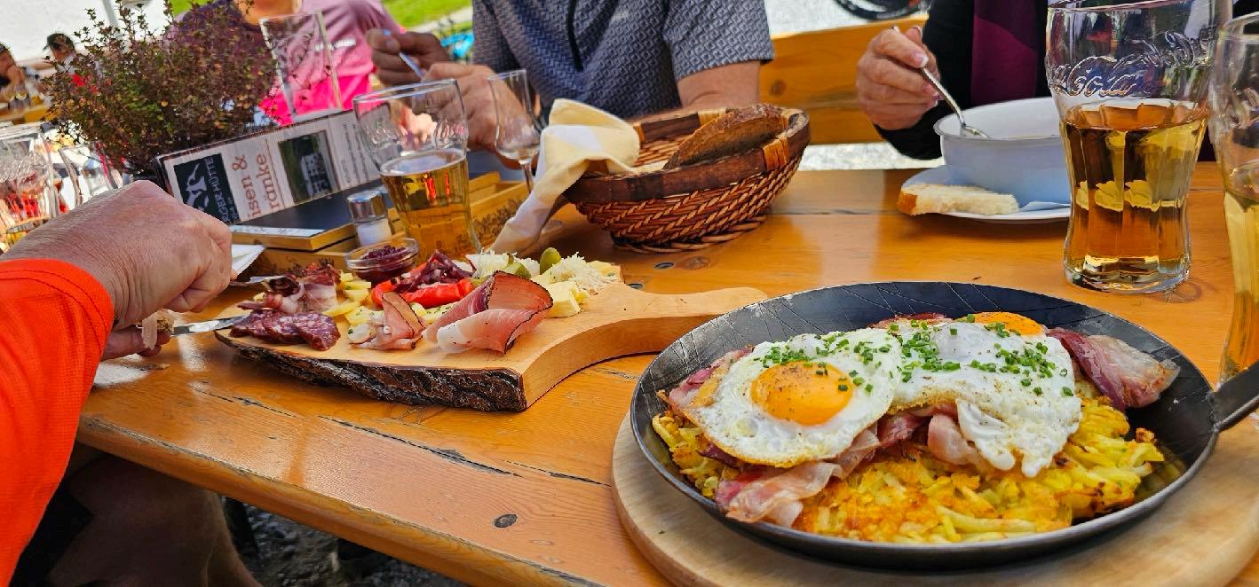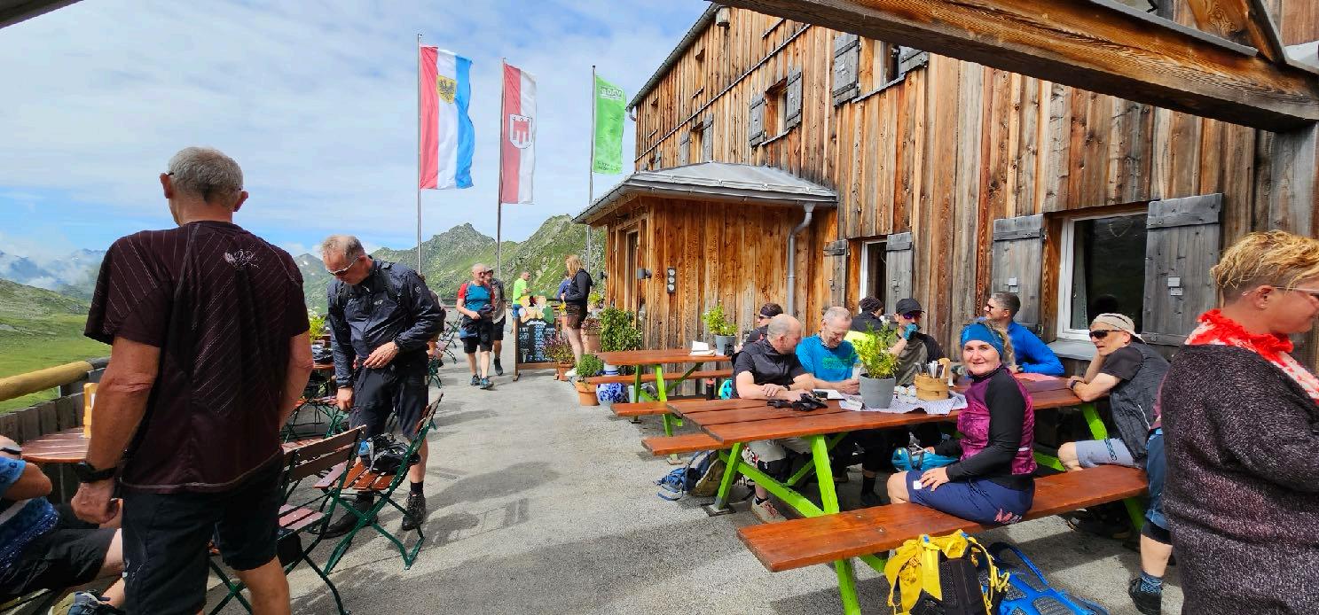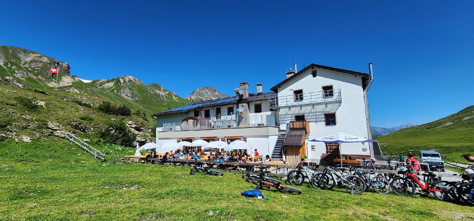 Im Anstieg zur Friedrichshafener Hütte kommen wir nochmals richtig ins Schwitzen. Belohnt werden wir mit einem super Trail Richtung Ischgl. Im 4Sterne Haus liegen bereits die (alkoholfreien) Weißbiere kalt und die Sauna ist geheizt. In der Regel haben wir hier auch Wäscheservice (gegen Gebühr), das heißt die verschwitzen Trikots sind am Morgen wieder frisch.