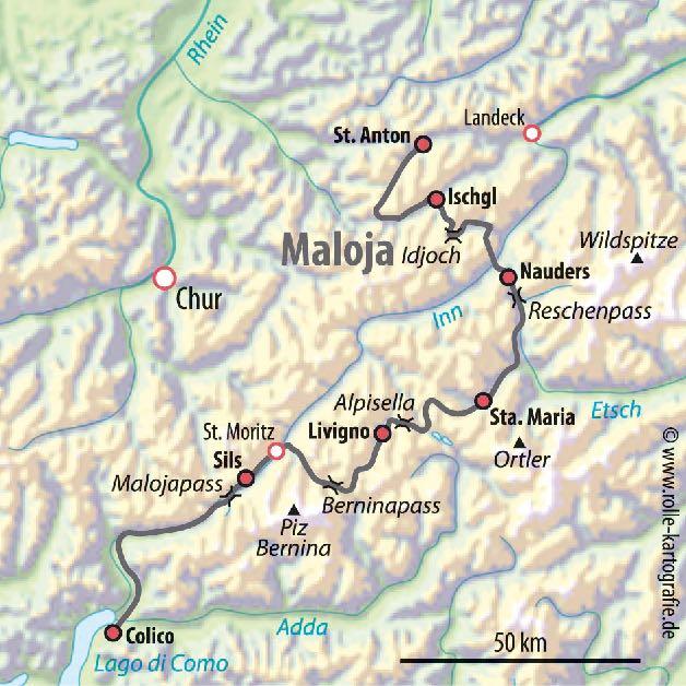 Die Schweizer Gletscher und das Engadin sind unangefoch ten der alpine Höhepunkt. Von hier aus trat der Alpentouris mus vor 200 Jahren seinen Siegeszug an. Die majestätische Bergwelt rund um St. Moritz hat auch heute noch nichts von ihrer Faszination eingebüßt. Im Gegenteil! Mit dem Moun tainbike lässt sich die Natur intensiver erleben als jemals zu vor. Die Strecke von St. Anton an den Comer See steckt vol ler Mountainbike-Klassiker, die man einmal im Leben erfah ren haben sollte. Vorausgesetzt, man hat das Fahrkönnen und die Kondition dazu. Andi Juen, ALPS-Guide