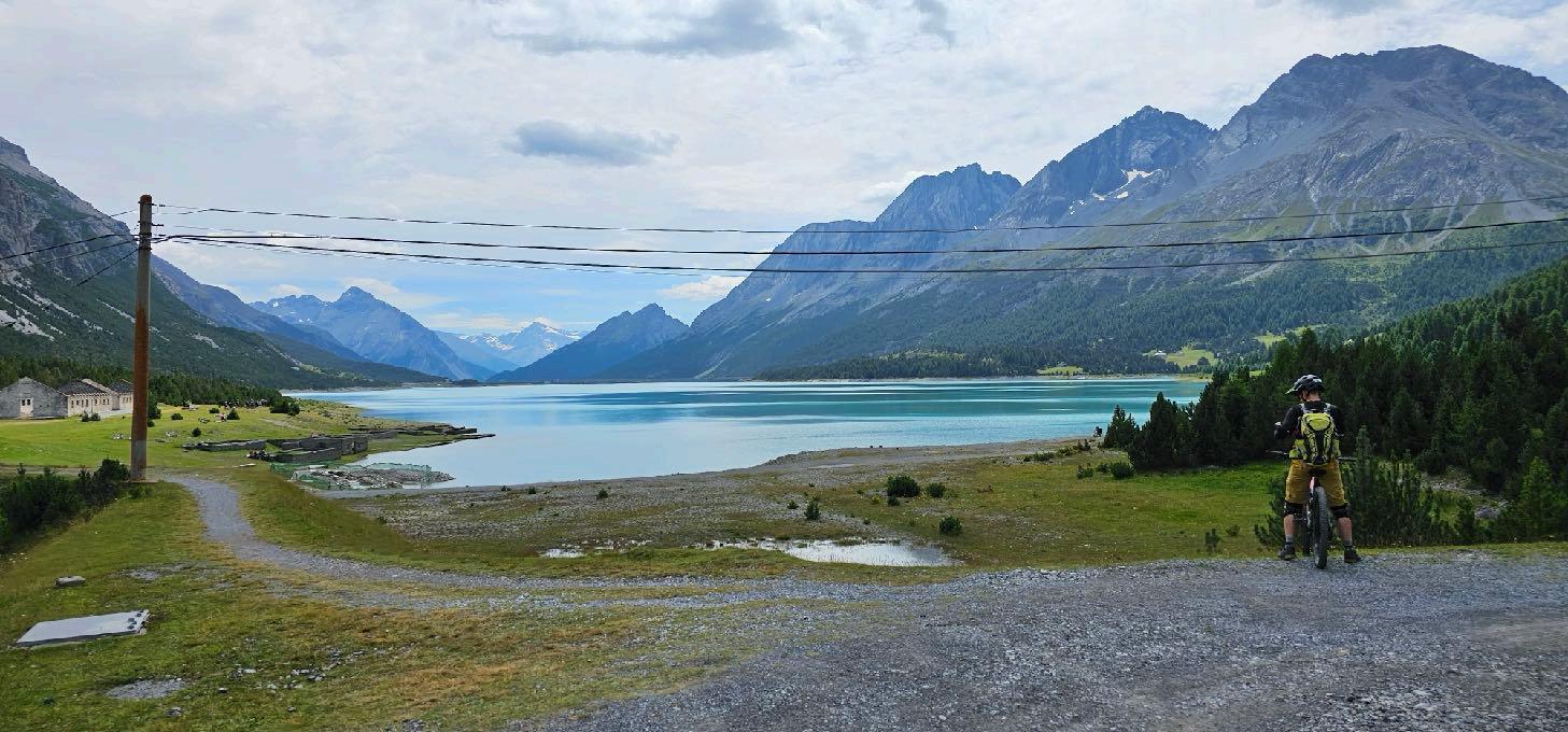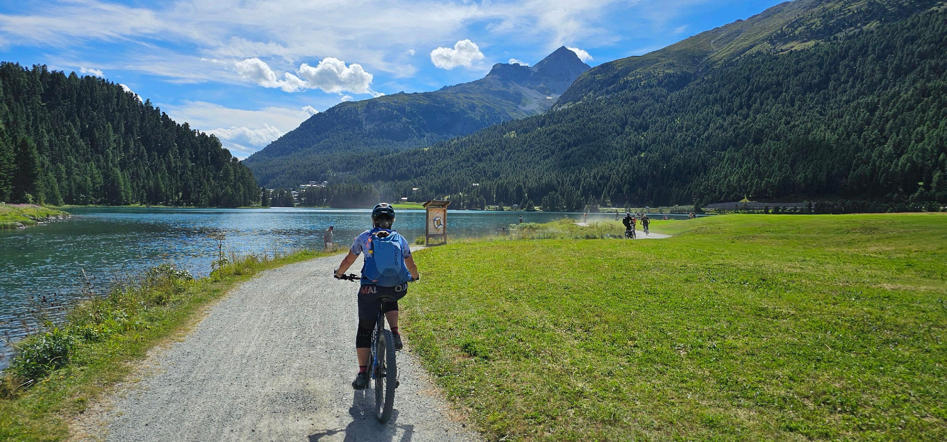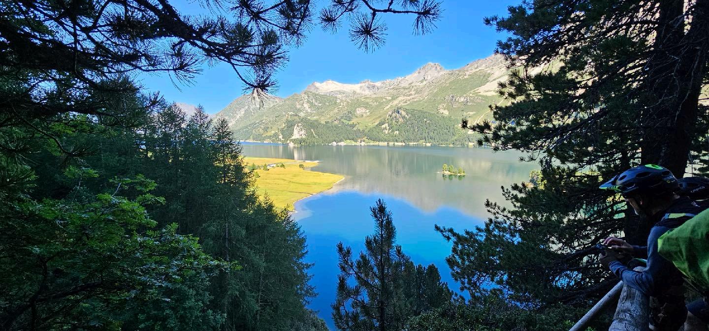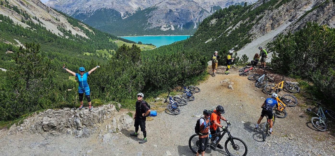 1250 Höhenmeter auf 66 Kilometer können ganz schön anstrengend sein. Dieses Resümee werden viele heute am Ende des Tages ziehen. Dabei erwarten uns den ganzen Tag nur beste Mountainbike-Wege auf unterschiedlichstem Untergrund. Zunächst geht es locker auf einem Asphaltradweg bergauf bis zum Einstieg der Schotterstrecke hoch zur Forcola di Livigno. Die letzten Spitzkehren auf einem schmalen Pfad sind nur erste Herausforderung für unsere Kletterer in der Gruppe. Fahrbar, aber ganz schön steil. Danach geht es technisch und anstrengend weiter. Der Anstieg zum Val Minor wurde zwar für Biker gebaut, fordert aber alle Kräfte. Selbst Spitzkehren gilt es bergauf zu meistern. Von hier oben beginnt eine Traumabfahrt auf einem Naturtrail hinunter zum Bernina Pass. Legendär ist auch der Trail weiter bis nach St. Moritz hinab. Wir rollen auf Schotter, Waldwegen und teils wurzeligen Singletracks. Auch die letzten Meter entlang der beiden Seen sind herrlichste Mountainbike-Wege. Ein rundum schöner Tag.