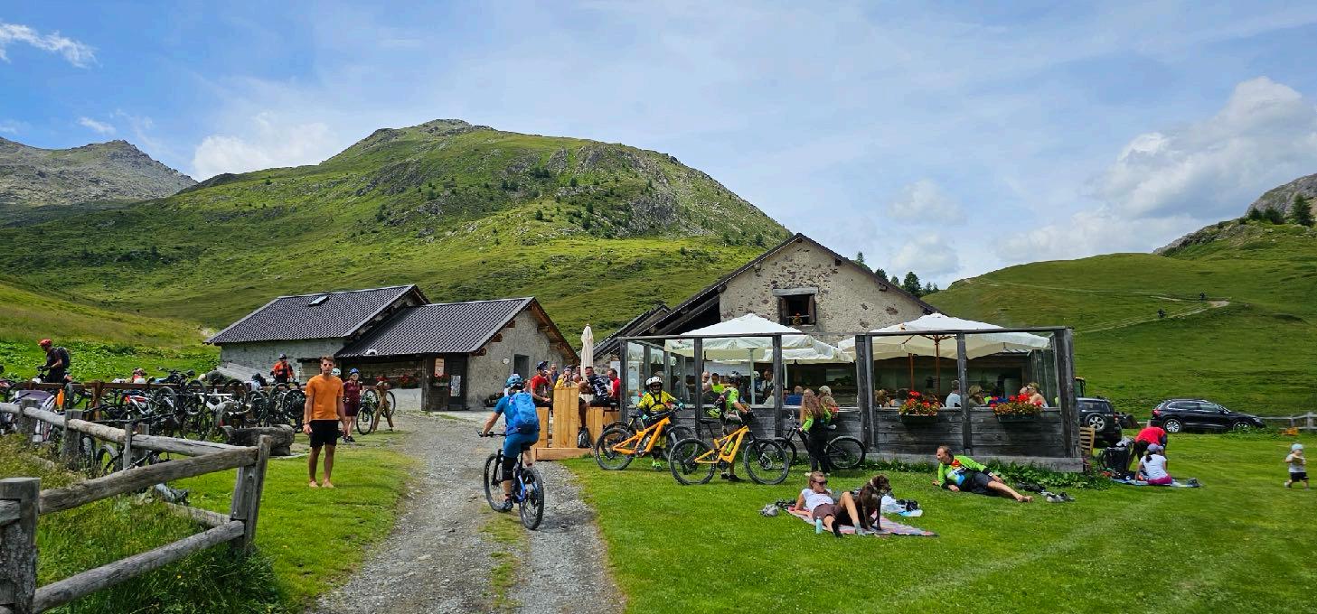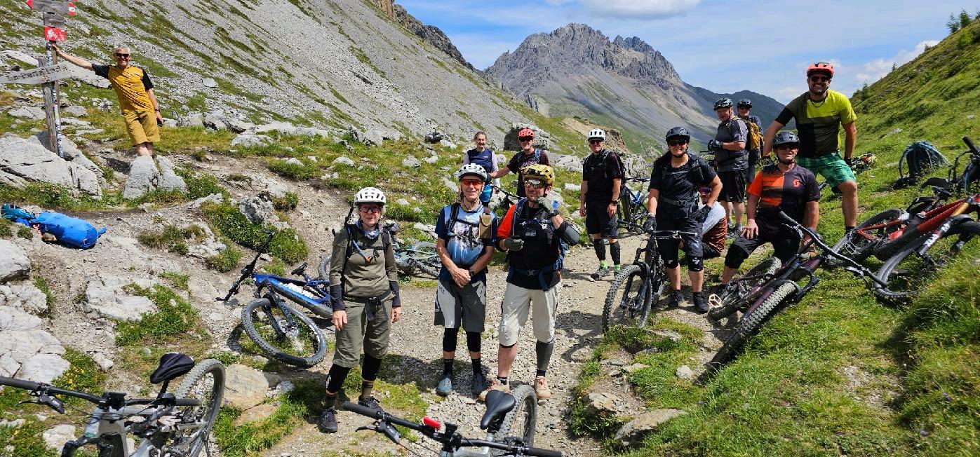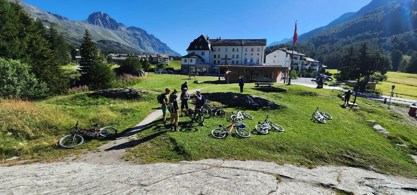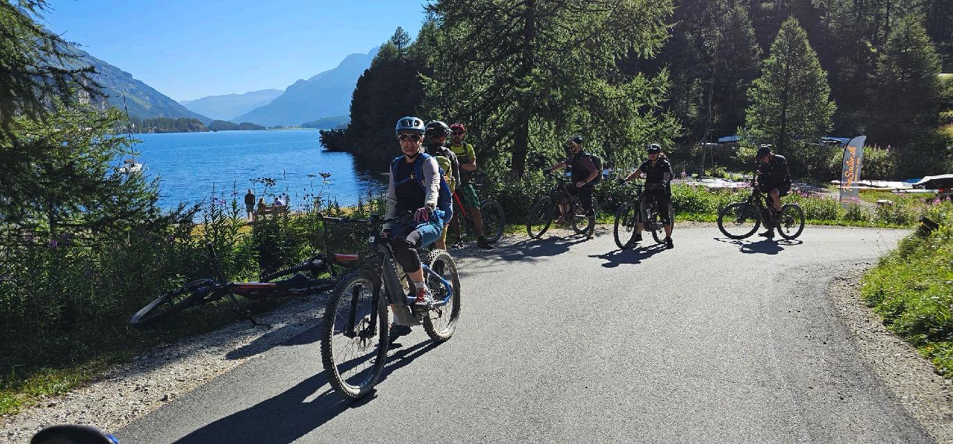 1250 Höhenmeter auf 66 Kilometer können ganz schön anstrengend sein. Dieses Resümee werden viele heute am Ende des Tages ziehen. Dabei erwarten uns den ganzen Tag nur beste Mountainbike-Wege auf unterschiedlichstem Untergrund. Zunächst geht es locker auf einem Asphaltradweg bergauf bis zum Einstieg der Schotterstrecke hoch zur Forcola di Livigno. Die letzten Spitzkehren auf einem schmalen Pfad sind nur erste Herausforderung für unsere Kletterer in der Gruppe. Fahrbar, aber ganz schön steil. Danach geht es technisch und anstrengend weiter. Der Anstieg zum Val Minor wurde zwar für Biker gebaut, fordert aber alle Kräfte. Selbst Spitzkehren gilt es bergauf zu meistern. Von hier oben beginnt eine Traumabfahrt auf einem Naturtrail hinunter zum Bernina Pass. Legendär ist auch der Trail weiter bis nach St. Moritz hinab. Wir rollen auf Schotter, Waldwegen und teils wurzeligen Singletracks. Auch die letzten Meter entlang der beiden Seen sind herrlichste Mountainbike-Wege. Ein rundum schöner Tag.