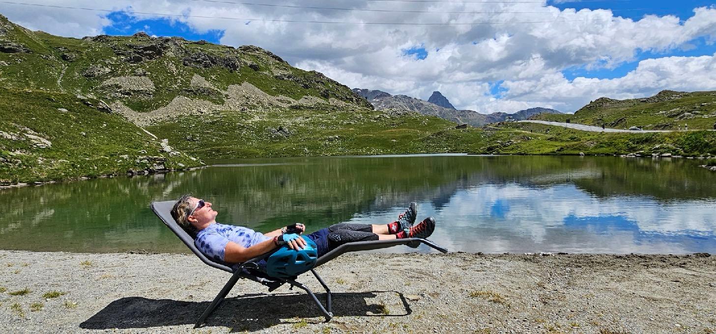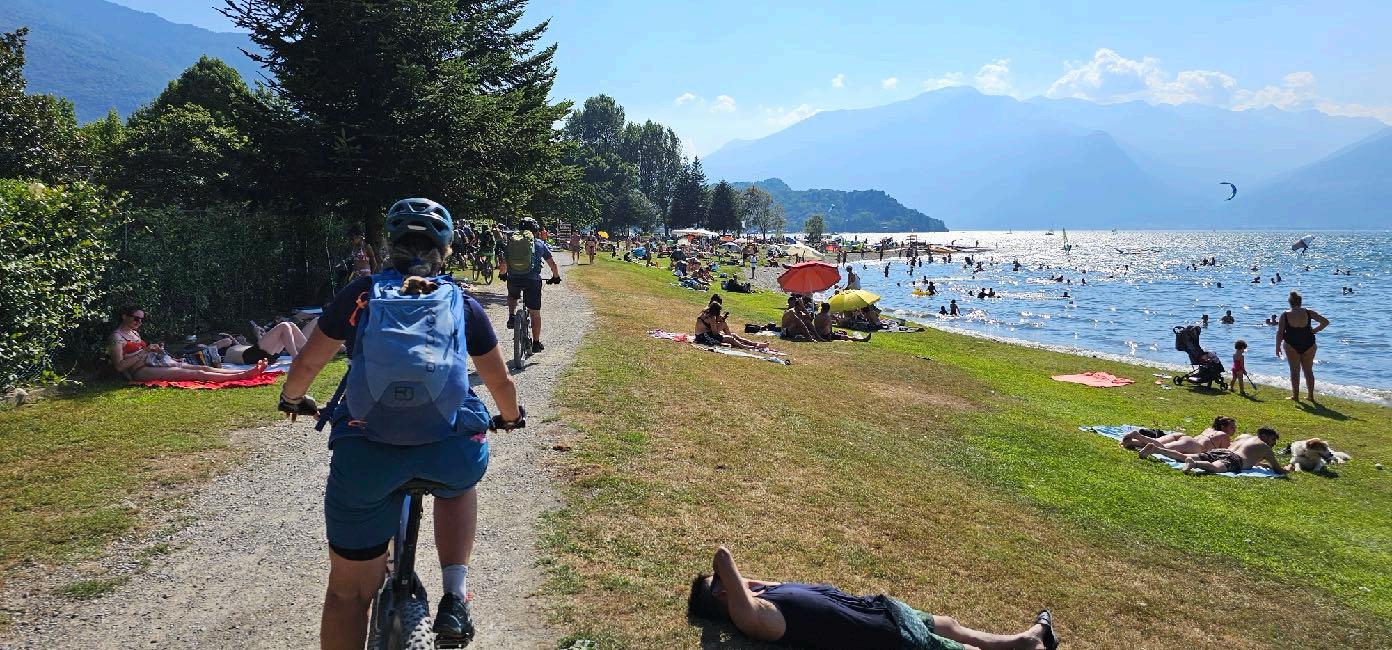 80 Kilometer stehen heute an, doch der Blick aufs Höhenprofil verrät eindeutig: es geht kilometerlang dabei bergab. Trotzdem darf man den letzten Tag nicht auf die leichte Schulter nehmen. Bereits die kurzen aber knackigen Silser Trails treiben den Puls nach oben. Die rauschende Asphalt-Abfahrt vom Maloja Pass mündet in wechselhaften Wegen bis zum Kaffeestopp bei Bregaglia. Ab hier haben die Italiener einen schönen Radweg gebaut, der direkt zu einem Gasthof führt. Die Strecke nach der Mittagspause birgt zwar keine fahrtechnischen Überraschungen, zieht sich aber ob der Kilometer in die Länge. Überwiegend auf Radwegen und guten Schotterstraßen erreichen wir schließlich verkehrsfrei unser Ziel: Den perfekten Badeplatz am Comer See.