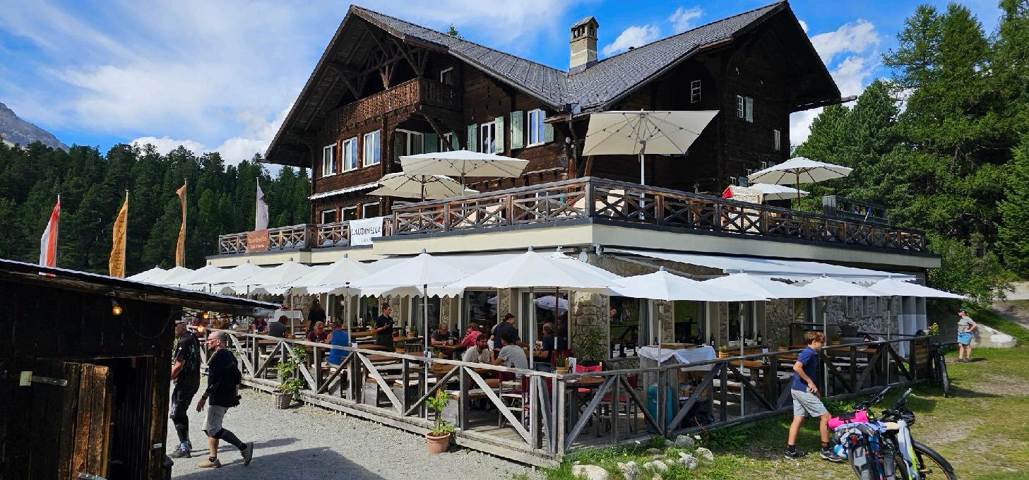 Schneller als gedacht ist der BerninaPass erreicht. Von da an geht es eigentlich nur noch bergab. Wir rasten mit Blick auf Diavolezza und Bernina Gletscher und gehen mit Spaß die Abfahrt an. Diese entpuppt sich als herrlichste Mountainbikestrecke mit netten Wegen in wahrer Postkartenlandschaft. Unvermittelt taucht dann der nächste Gigant auf. Waren wir eben noch ganz auf den Weg und einige Wurzeln konzentriert, schlägt uns jetzt der gewaltige Morteratschgletscher in seinen Bann. Wir lassen uns in einer urigen Käserei den verdienten Kuchen schmecken. Der Tag könnte immer so weiter gehen. Auf schönsten Waldwegen rollen wir an Pontresina vorbei und nähern uns schnell dem mondänen St. Moritz. Erst jetzt spüren wir, dass selbst 1000 Höhenmeter ganz schön anstrengend sein können. Glücklicherweise müssen wir nur noch zwei der drei Engadiner Seen umrunden, ehe wir ausgepowert und glücklich unser Tagesziel erreichen. Ein nettes Schweizer Hotel mit allem Komfort erwartet uns in Sils.