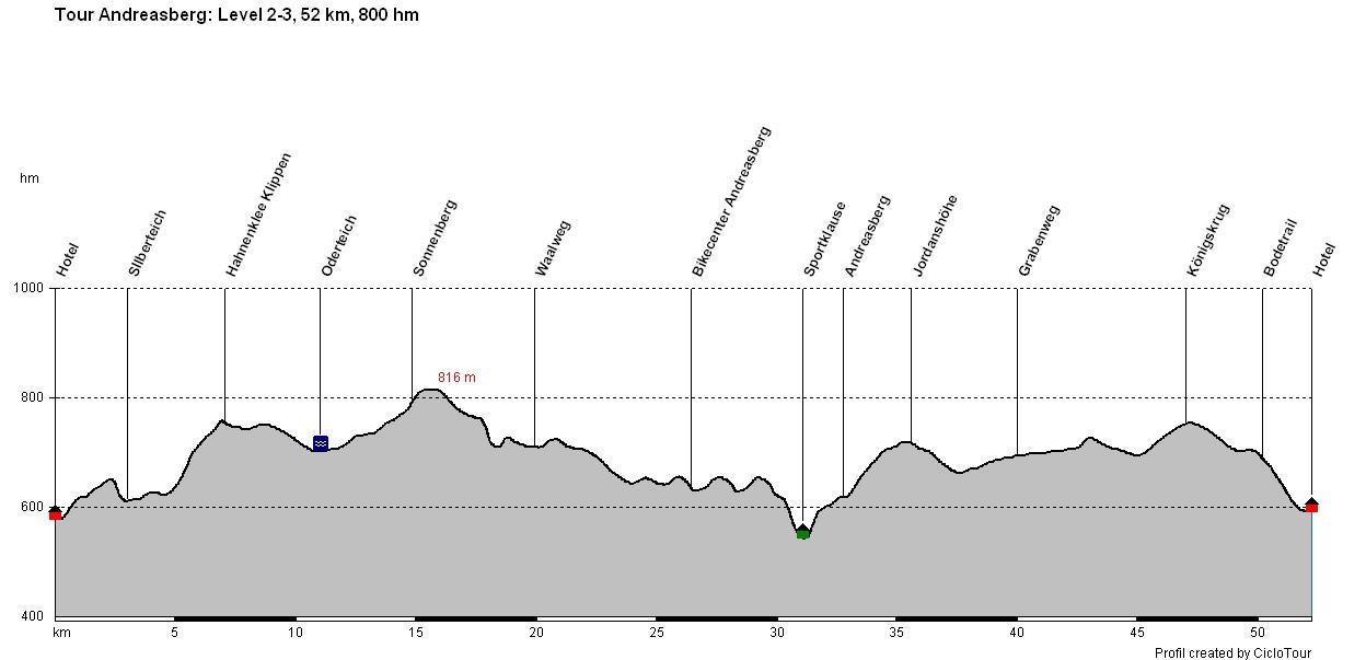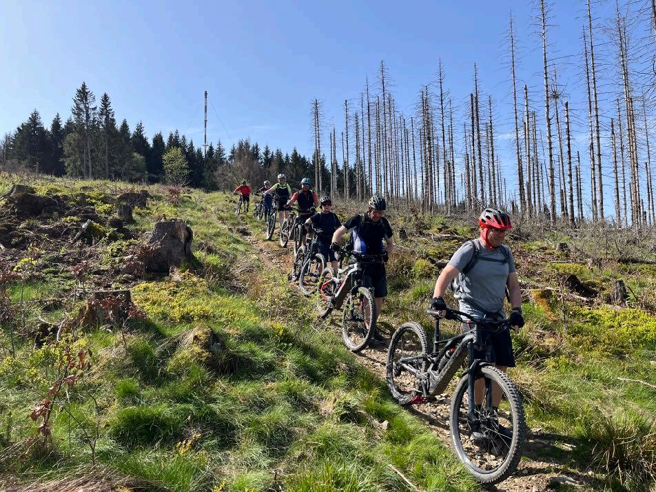 Die heutige Tour führt uns vor die Tore von Bad Harzburg. Direkt hinter dem Hotel starten wir auf dem Waldweg Richtung Achtermann. Kurz davor halten wir uns rechts und erreichen nach 300 Höhenmeters den Dreieckigen Pfahl. Nun weiter am Grenzplattenweg und in die Forstwegabfahrt Richtung Torfhaus. Kurz vor Torfhaus fahren wir den Goetheweg, ein super schöner Waalweg Abschnitt. In den Torfhaus bestaunen wir den neuen Aussichtstower. Nun teils über Trails, teils auf Waldwegen bergab ins Radautal. Hier ist es wild und einsam. Nun steigen wir ein in den Winterberg. Hier versteckt sich ein herrlicher Flowtrails bis zum Baumwipfelpfad von Bad Harzburg. Nun nochmals 200 Höhenmeter klettern um im Molkenhaus zur Mittagspause einzukehren. Nach der Pause gibt es verschiedene
