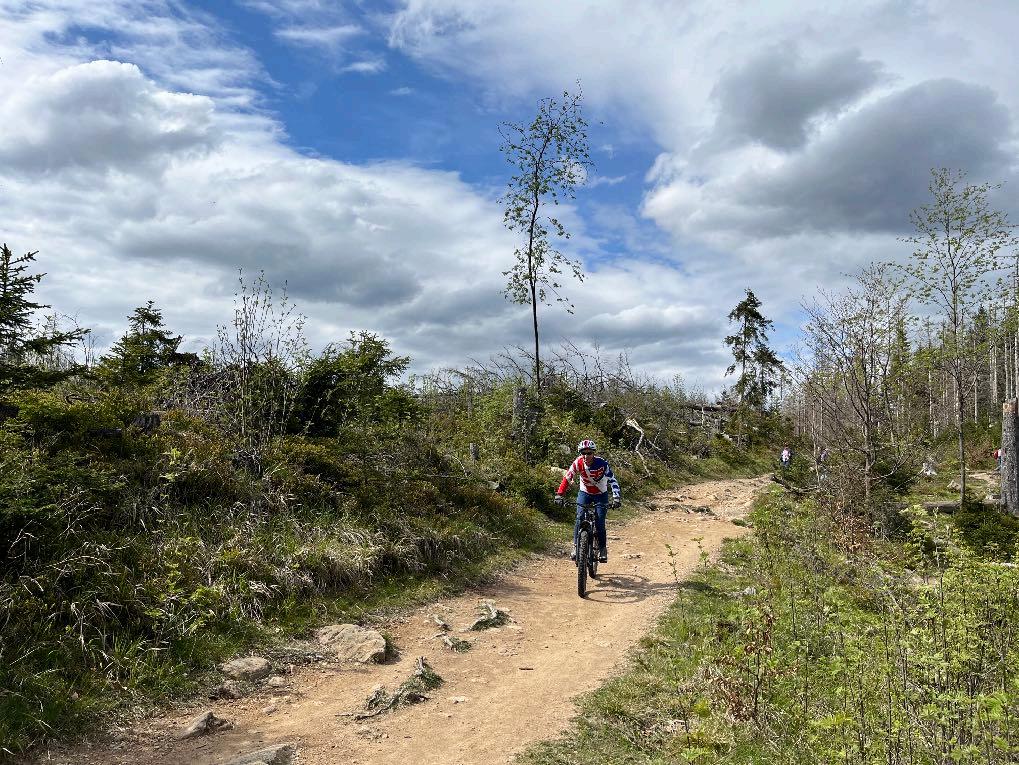 Abschlusstag beim TRAILCamp Harz. Natürlich fehlt noch ein Gipfelder Gipfel. Der höchste Berg in Norddeutschland ist das Ziel der Halbtagestour. Bisher nur aus der Ferne gesehen, erleben wir heute den Brocken hautnah. Oft herrscht dort oben ein anderes Klima als in Braunlage. Vorbei am Wurmberg und über den Ulmer Weg Trail gelangen wir zum Dreieckiger Pfahl. Es folgt ein Stück Grenzplattenweg mit einem kurzen Steilstück. Danach sind die größten Mühen gemeistert. Den Goetheweg teilen wir mit einigen aber meist freundlichen Wanderern. Der letzte Kilometer zum Brockengipfel führt über die Asphaltstraße. Im Level 3-4 werden vor dem Gipfel noch einige steinige und in kurzen Abschnitten auch verblockte Trails gefahren. Auf dem Brocken genießen wir dann einen tollen Rundblick in alle Himmelsrichtungen. Die Abfahrt erfolgt zunächst auf gleichen Wegen. Am Dreieckigen Pfahl schleifen wir in die Abfahrt Richtung Braunlage ein. Zum Abschluss des Camps verweilen wir noch bei frischen Waffeln auf dem Rodelhaus bevor wir über den Wurmbergtrail zurück ans Hotel gelangen. Beim Waschen bwz. Verladen der Bikes verabschieden wir uns bis zum nächsten Jahr.
